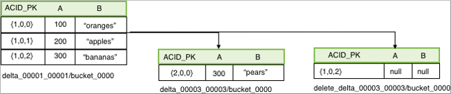 A delete statement that matches a single row also creates a delta file, called the delete-delta. The file stores a set of row IDs for the rows that match your query. At read time, the reader looks at this information. When it finds a delete event that matches a row, it skips the row and that row is not included in the operator pipeline. The following example deletes data from a transactional table: