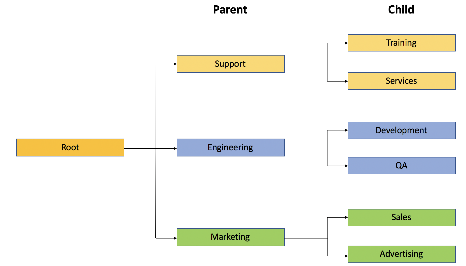 For example, suppose that a company has three organizations: Engineering, Support, and Marketing. The Engineering organization has two sub-teams: Development and QA. The Support organization has two sub-teams: Training and Services. And finally, the Marketing organization is divided into Sales and Advertising. The following image shows the queue hierarchy for this example: