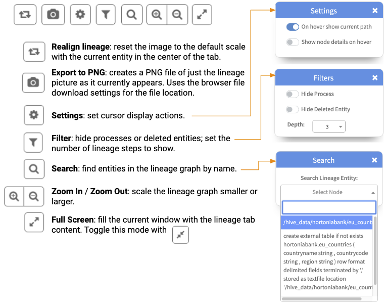 |  | Lineage | Connects the current entity with entities that provided input data. Entities connected with yellow lines are ancestors of the current entity. |