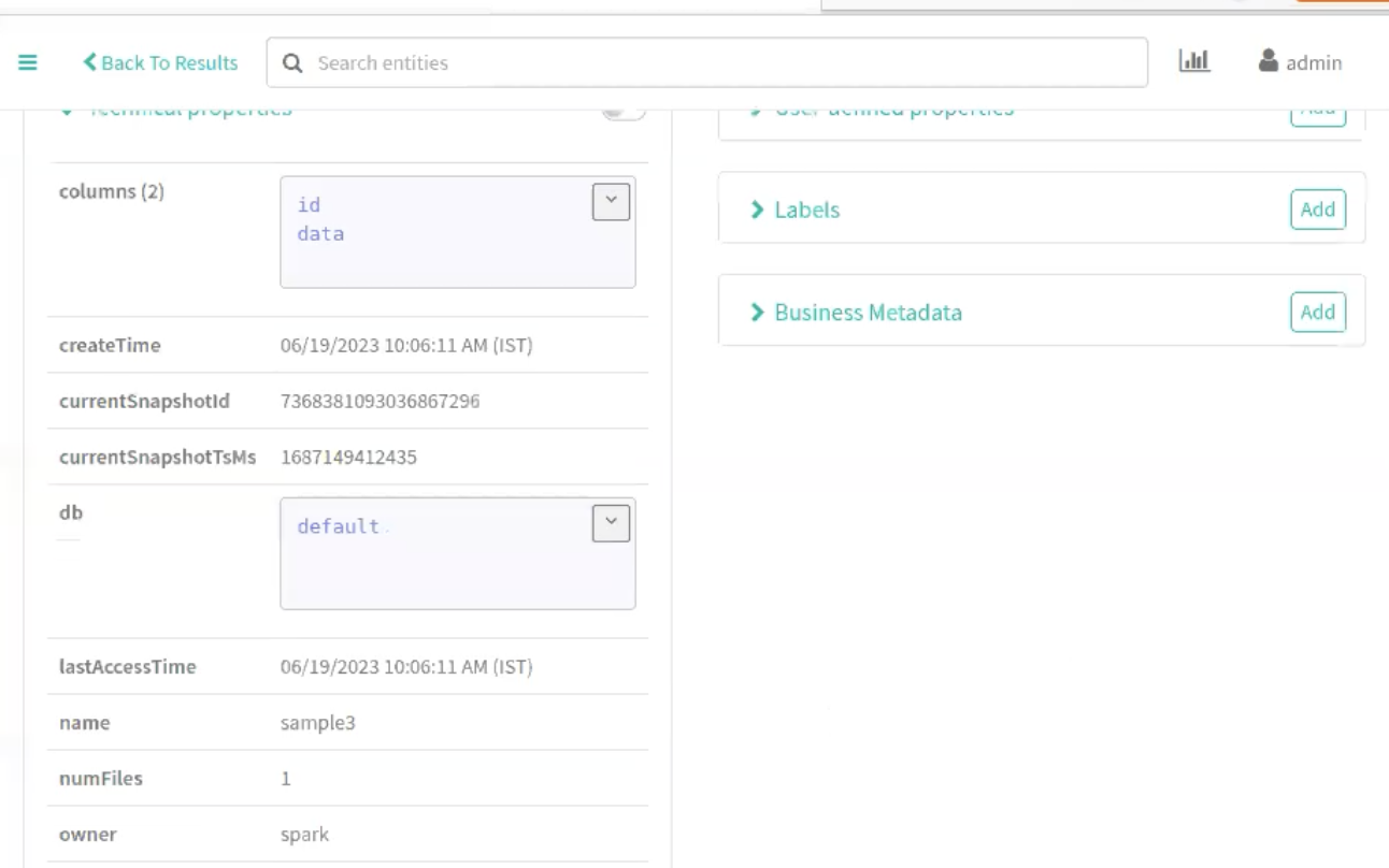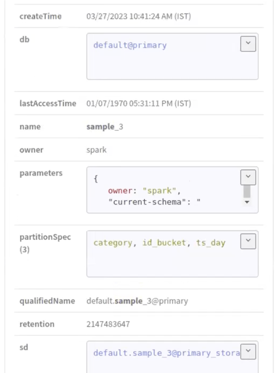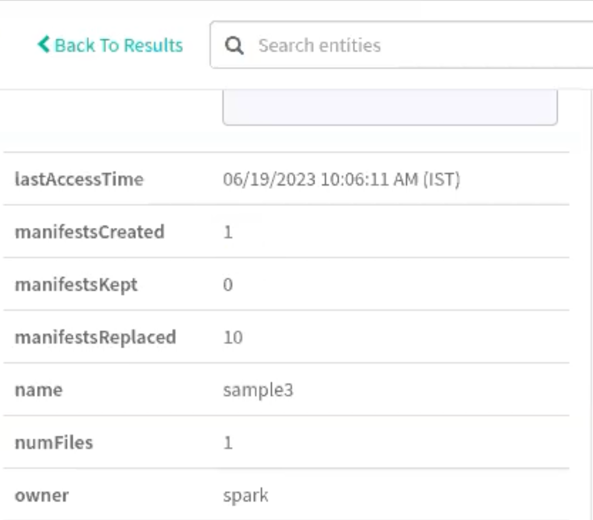 Run the following command to display relevant snapshot table parameters as attributes in Atlas. For example: Existing snapshot ID, current snapshot timestamp, snapshot count, number of files and related attributes.