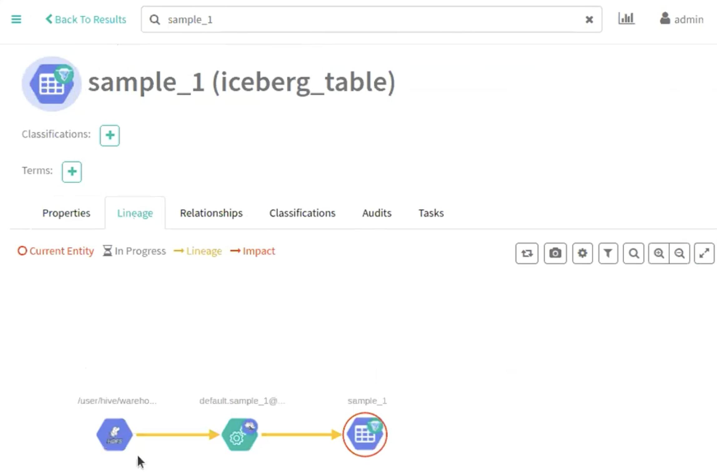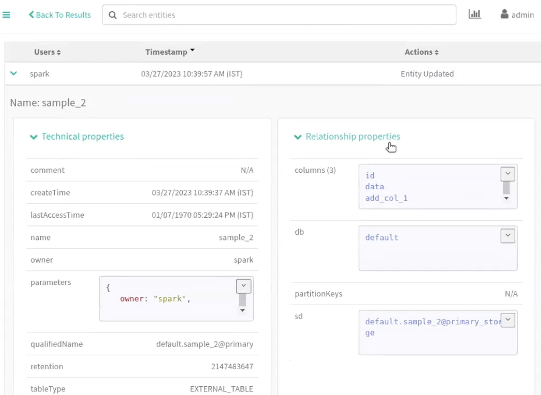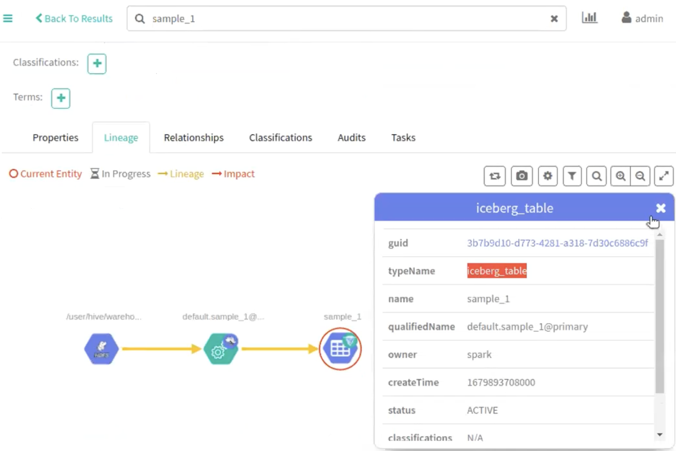 Run the following command to display relevant snapshot table parameters as attributes in Atlas. For example: Existing snapshot ID, current snapshot timestamp, snapshot count, number of files and related attributes.