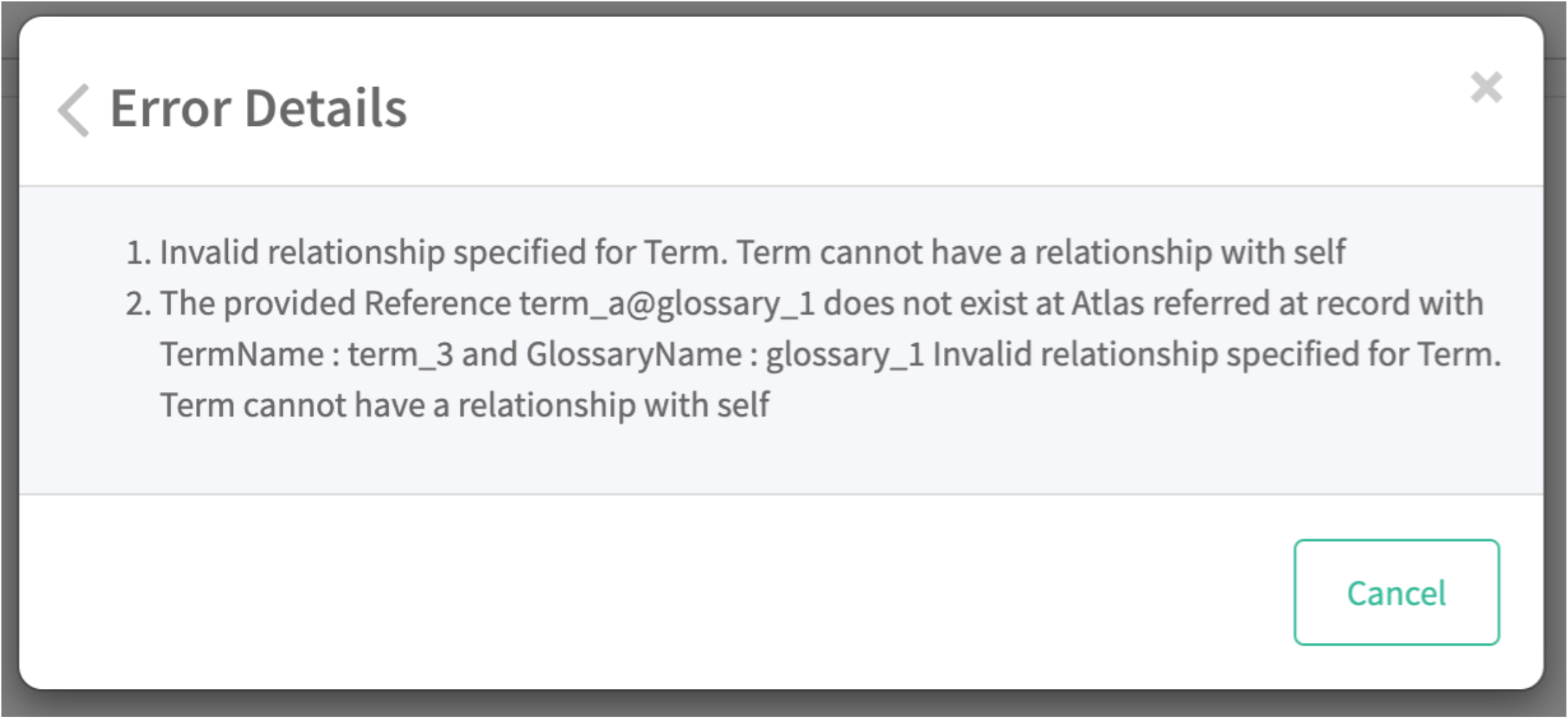 A new error message is displayed pertaining to the imported CSV file containing specific entries that are not in agreement with the conformed standards with which Atlas operates. The error might be due to a wrong format for including the terms or not adhering to the defined standards. The error message that gets displayed provides all the changes that need to be made.