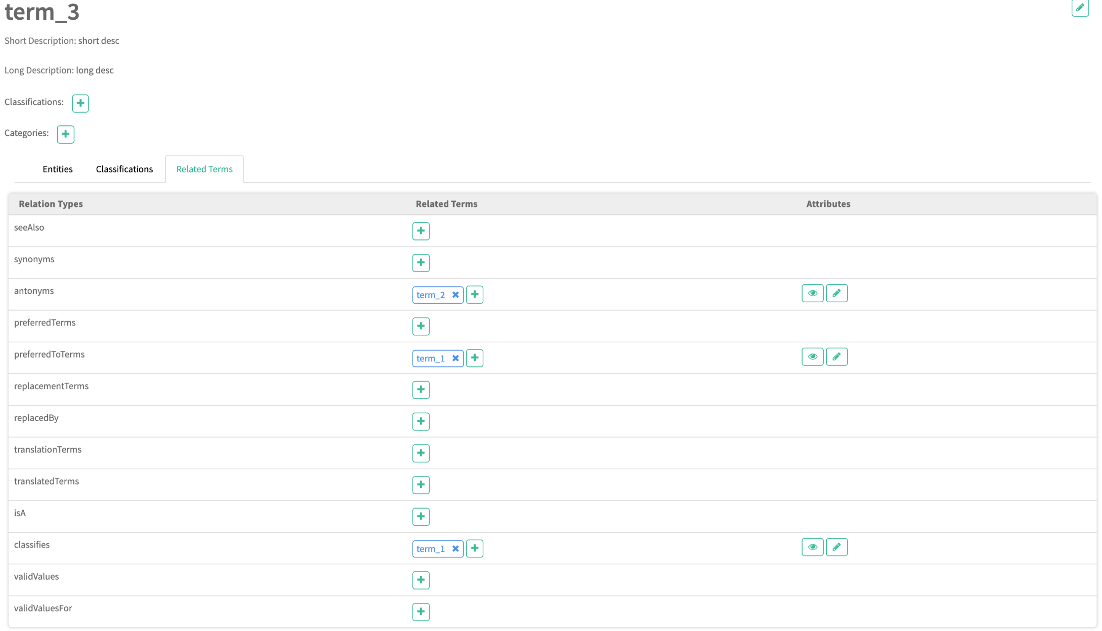 ReplacementTerms, SeeAlso, TranslatedTerms, IsA, Antonyms, Classifies, PreferredToTerms,