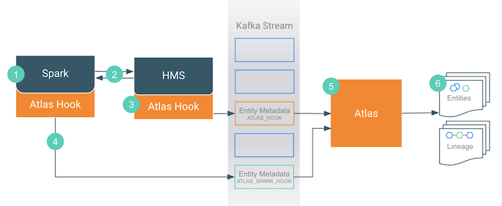 - The Atlas hook corresponding to the Spark instance collects information for the action and forms it into metadata entities. It publishes the metadata to a different Kafka topic named ATLAS_SPARK_HOOK.