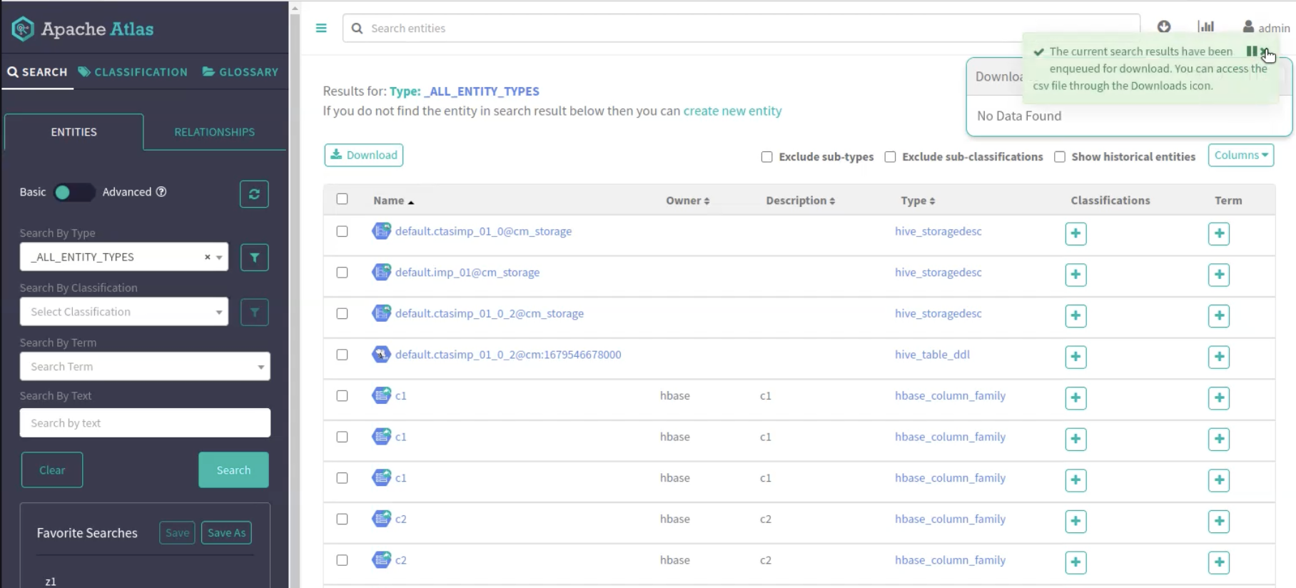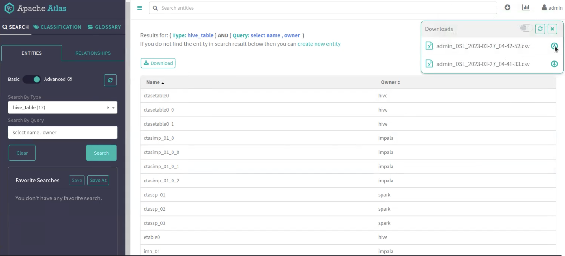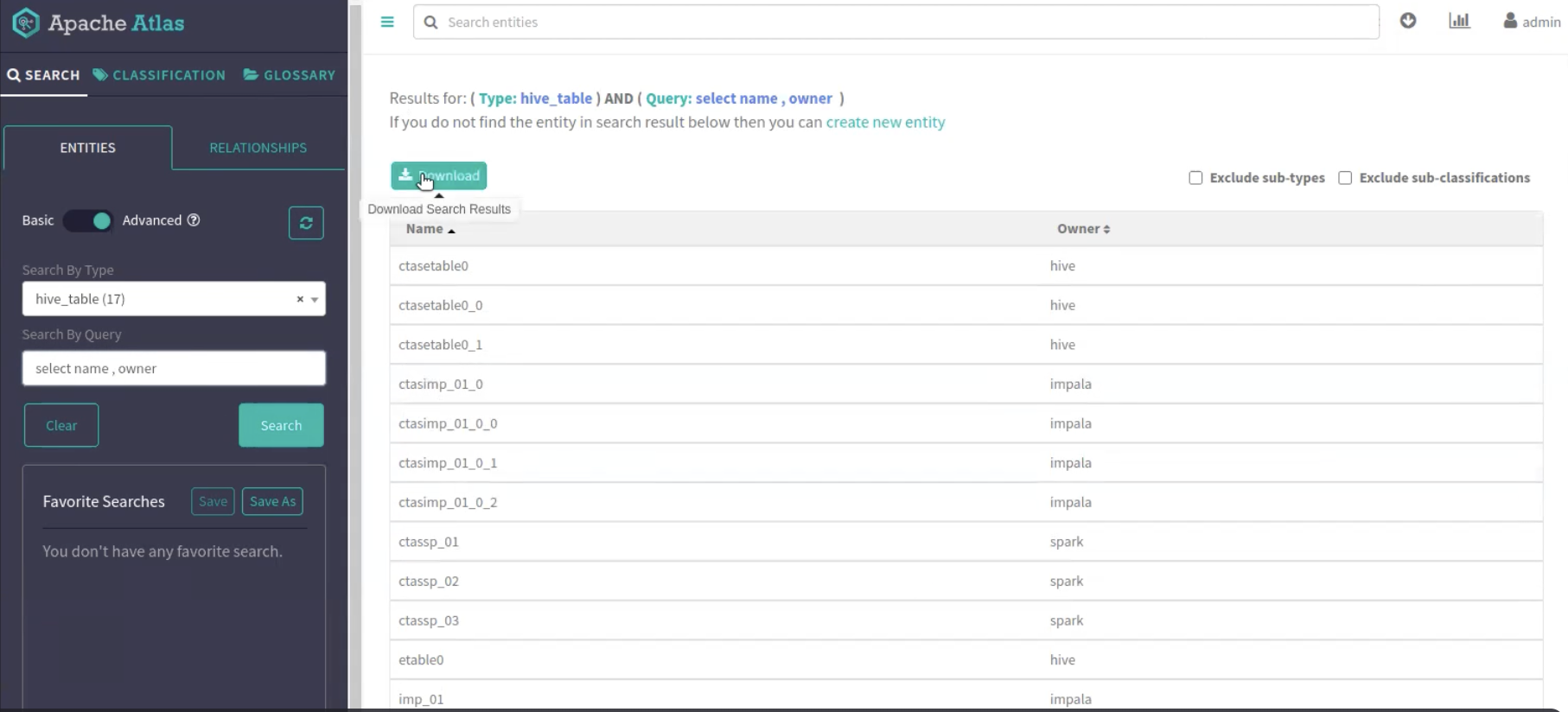 You can search using the Advanced option and download the search results. For example, you can search by using the name and owner criteria. Click Download and follow the same process as described while performing the Basic search operations.