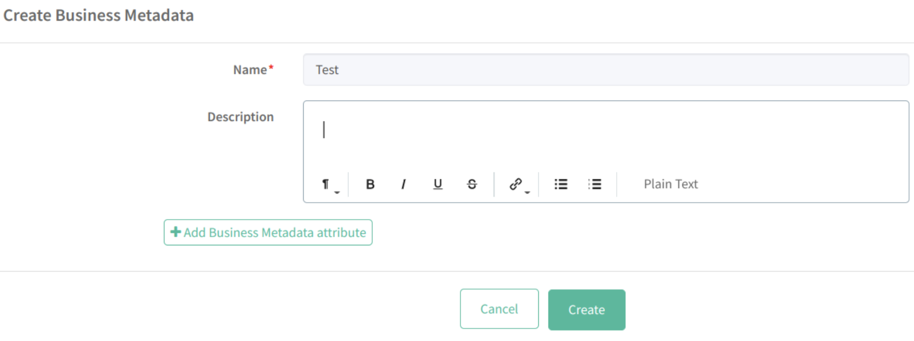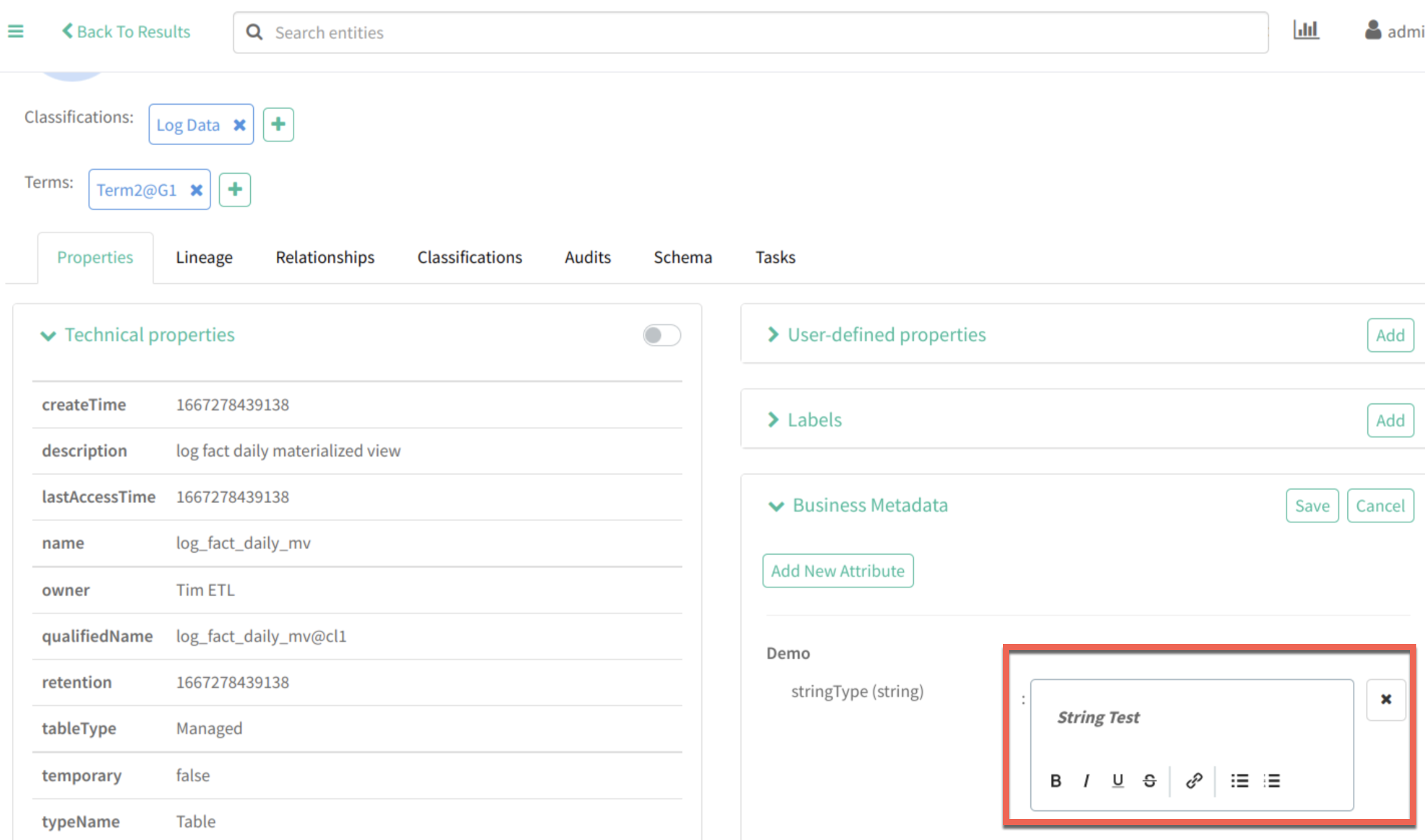 In Atlas, while creating Classification, Glossary, and Business metadata, a new text editor is available, which can also be used for adding and customizing string attribute values of Business metadata on the Entity details page.