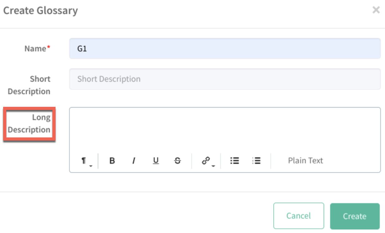 Note that while creating and editing Glossary, Term, and Category, the text editor is available only for the Long Description field. For creating and editing Business Metadata and Classification, text editor is available only for the Description field.