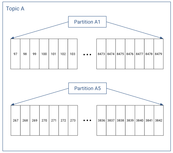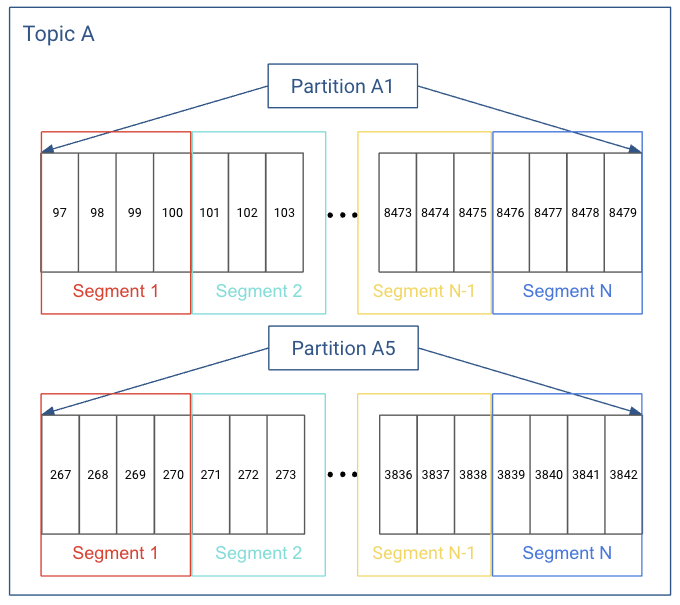 Each of the partitions is broken into segments, with Segment N containing the most recent records and Segment 1 containing the oldest retained records. This is configurable on a per-topic basis.