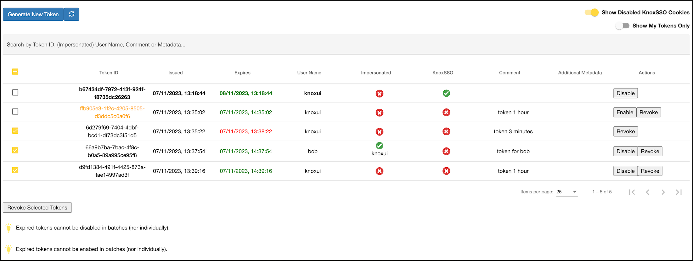 - Show Disabled KnoxSSO Cookies - This is true by default. Since disabled KnoxSSO cookies remain in the underlying token state service until they expire, it may bother users to see them in the tokens table. Flipping this toggle button helps to hide them.
