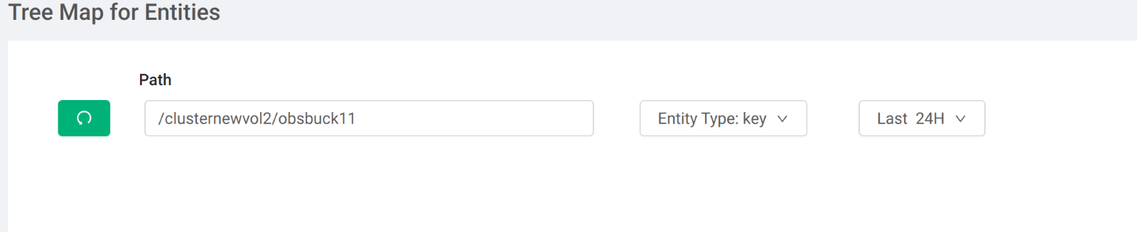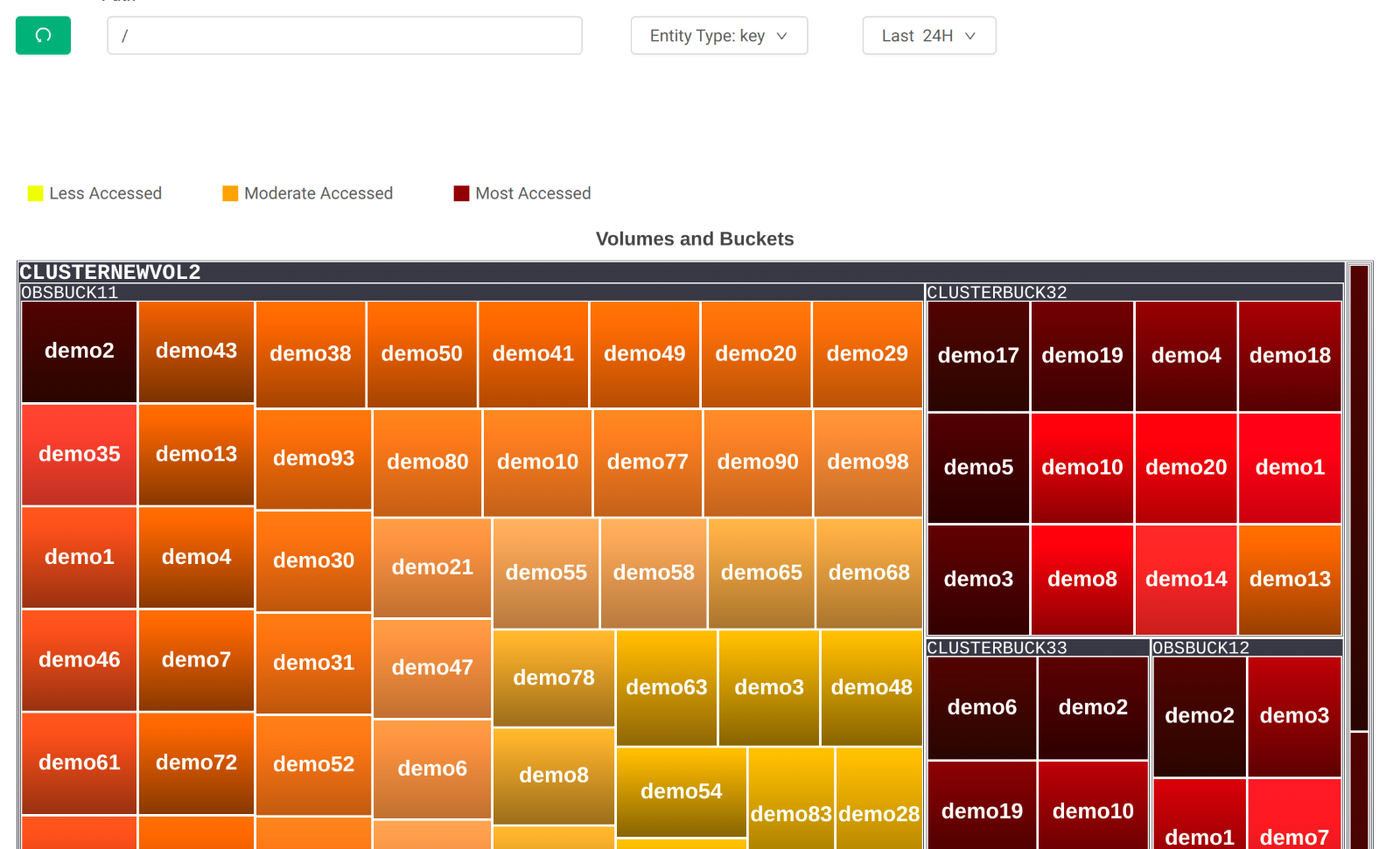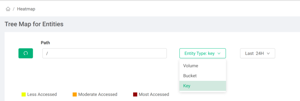 When you select Key as the entity type and provide a path in the search box, you will see the heatmap representation at the specified path level. This means the application builds a heatmap based on the top 100 keys (most accessed or most heated keys) for the path provided. The path can contain numbers, letters, and forward slash.