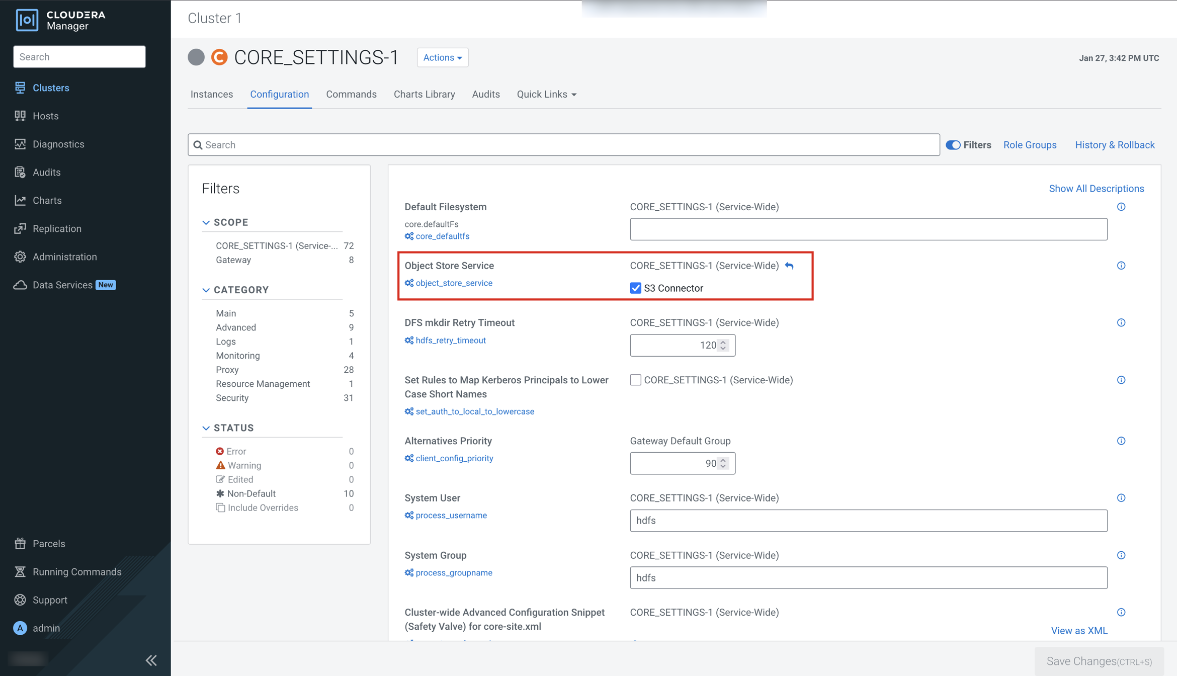 to Clusters > Configurations > Object Store Service, select S3 connector check box and click