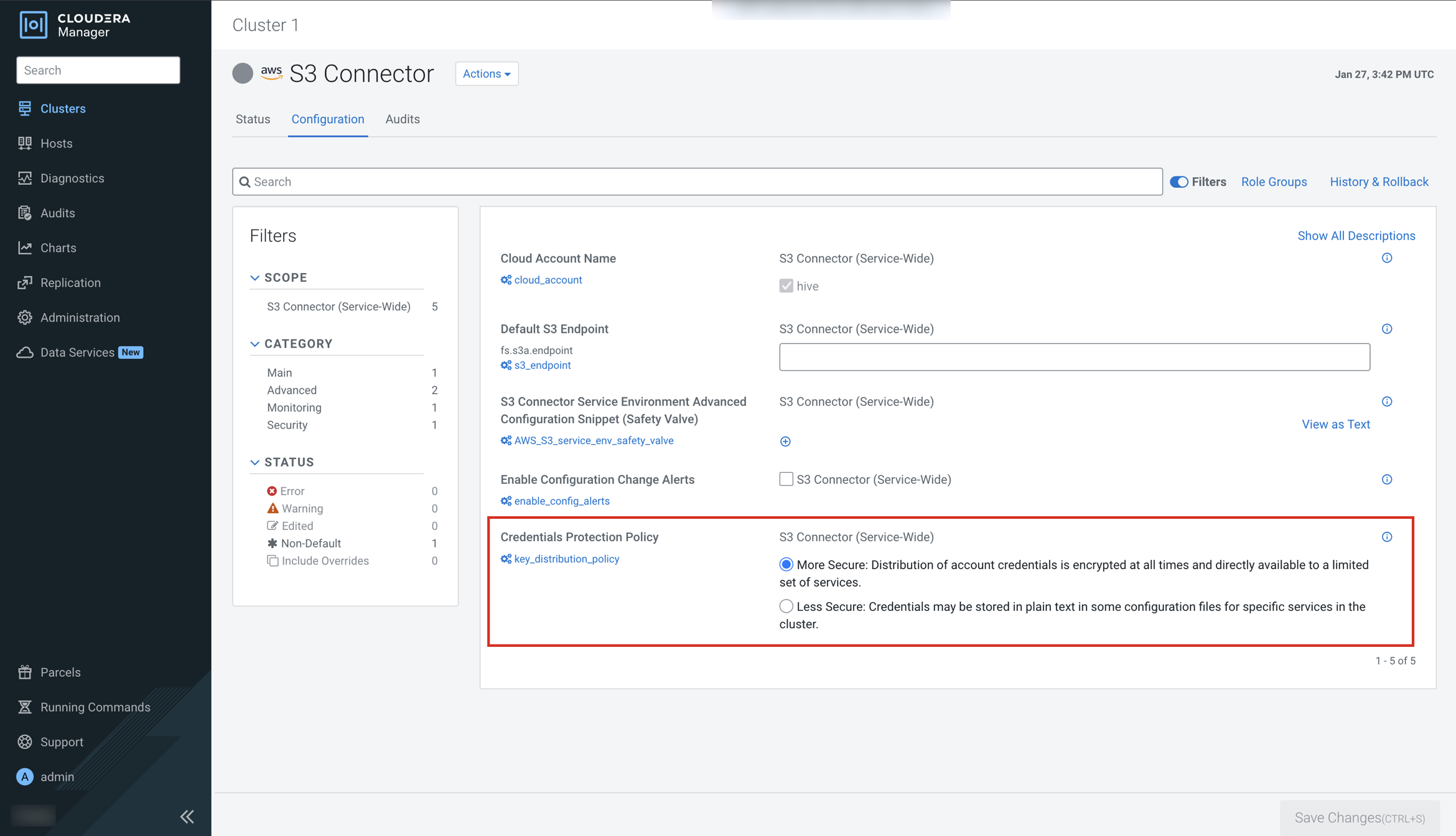 Navigate to Clusters > S3 Connector > Configuration > Credentials Protection Policy, select More Secure option and click