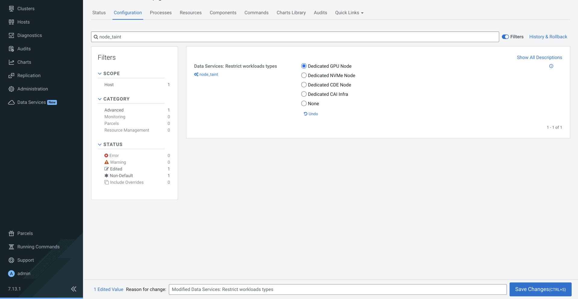 node_taintproperty on the Cloudera Embedded Container Service Host Configuration page:- Select Dedicated GPU Node to dedicate the node for Cloudera AI workloads.