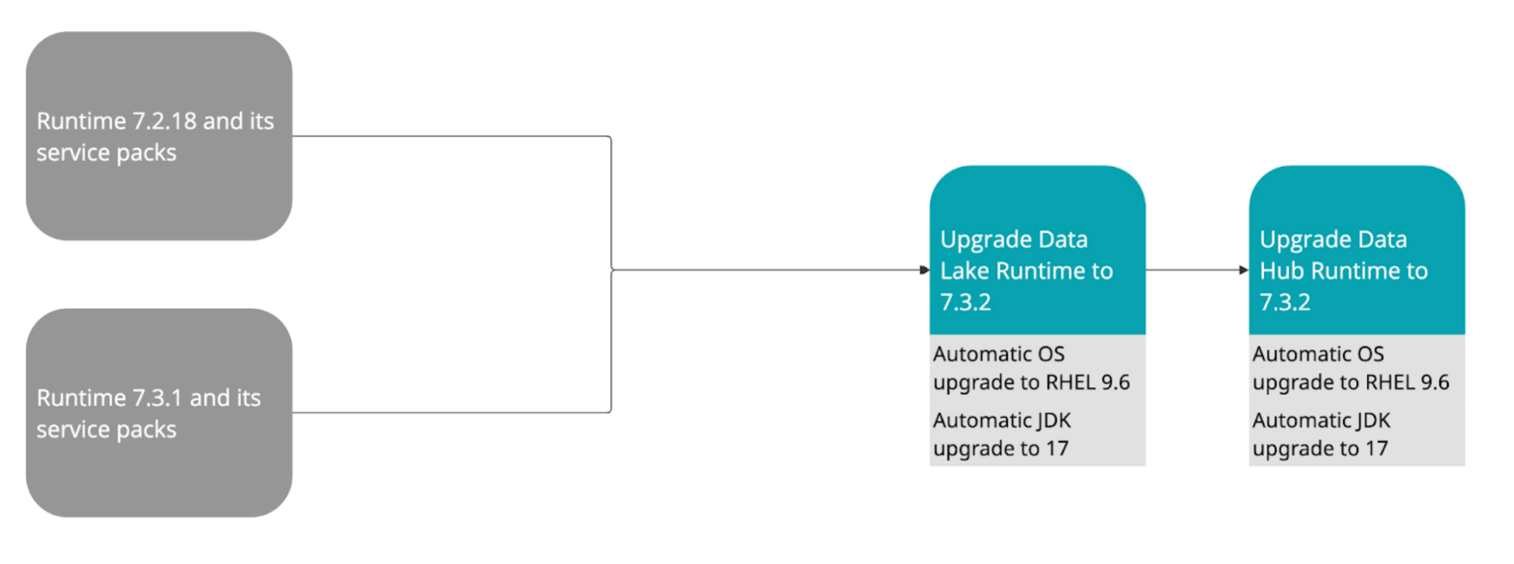 For Data Lakes, the Runtime and OS upgrade is performed in one step. For Cloudera Data Hub clusters, the Runtime and OS upgrade is performed in one