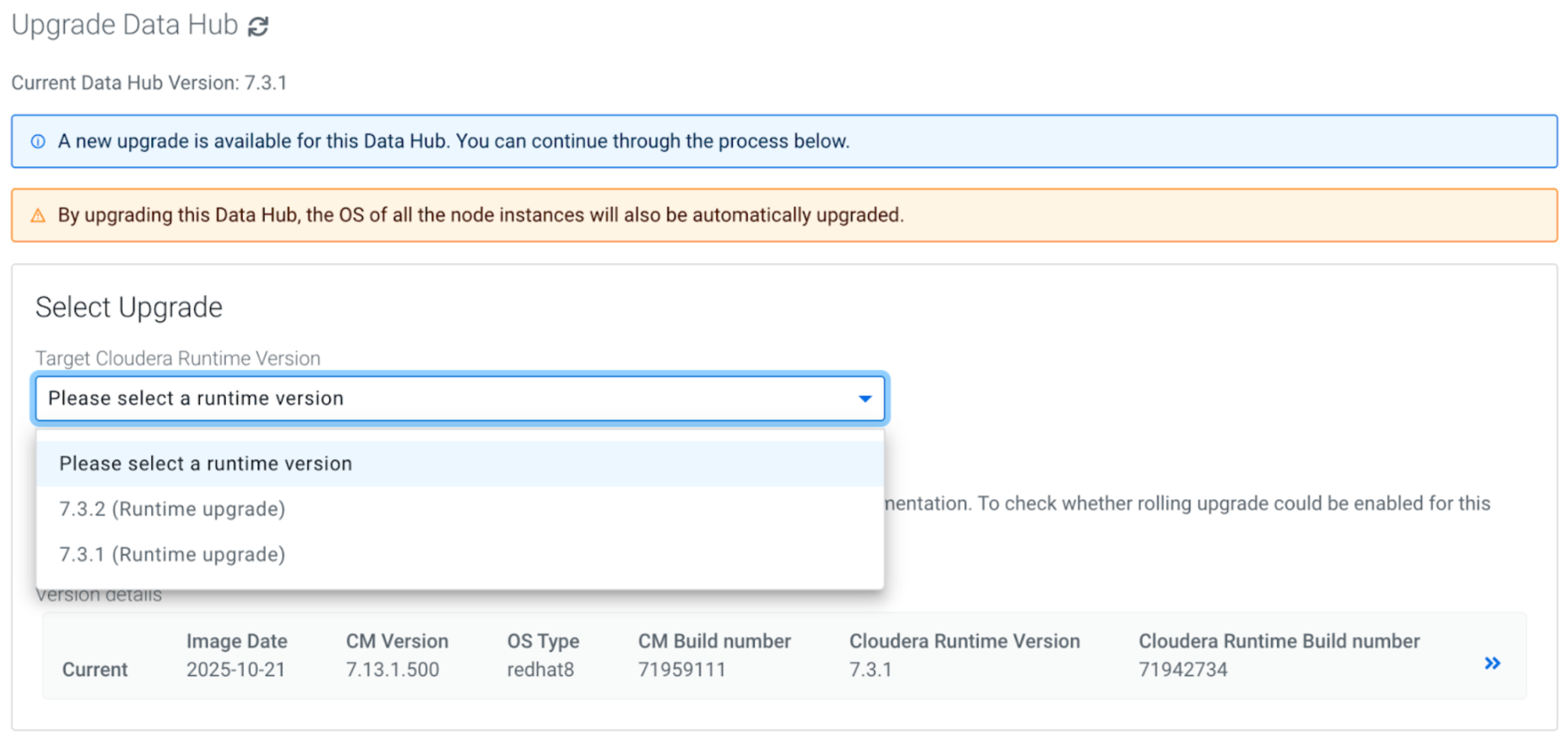 The Cloudera Data Hub upgrade to 7.3.2 includes an automatic OS