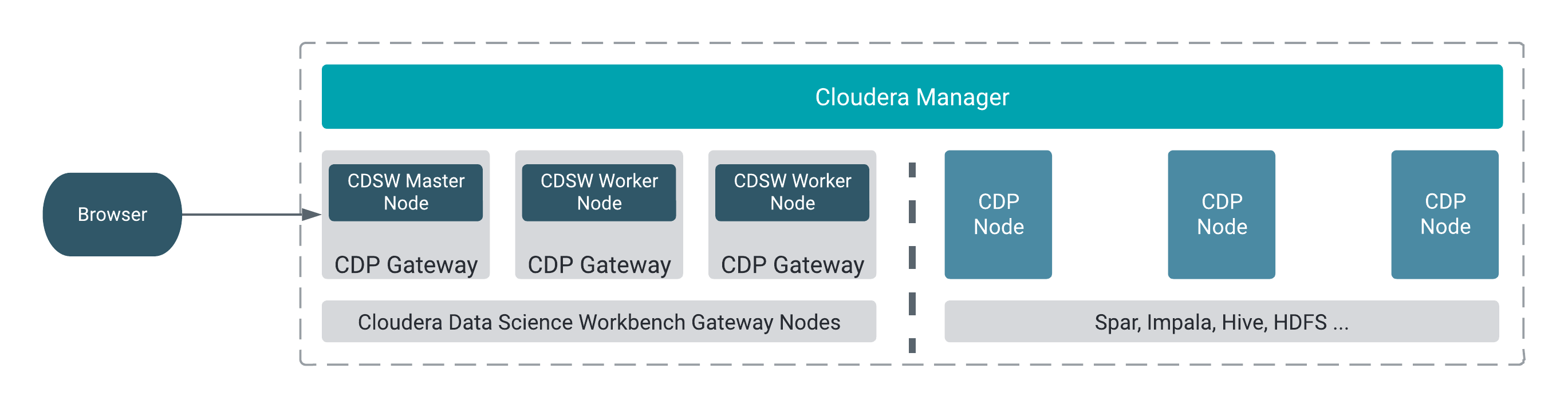 Cloudera Data Science Workbench runs on one or more dedicated gateway hosts on CDP clusters. Each of these hosts has the Cloudera Manager Agent installed on them. The Cloudera Management Agent ensures that Cloudera Data Science Workbench has the libraries and configuration necessary to securely access the CDP cluster.