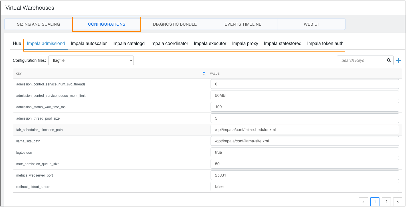 When you create an Impala Virtual Warehouse, it is automatically optimized for your workload by the Cloudera Data Warehouse service. Due to the containerized and compute-isolated architecture of Cloudera Data Warehouse, as well as intelligence to assign different default configurations, you do not have to customize your environment to optimize performance or to avoid resource usage spikes and out-of-memory conditions. However, if you must adjust some settings to suit your needs after creating an Impala Virtual Warehouse, you can add particular component configuration details in one of the free-form fields on the SIZING AND SCALING tab or under one of the components available under the CONFIGURATIONS tab for a selected Virtual Warehouse.