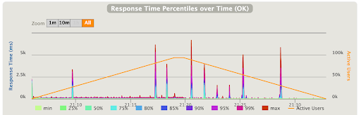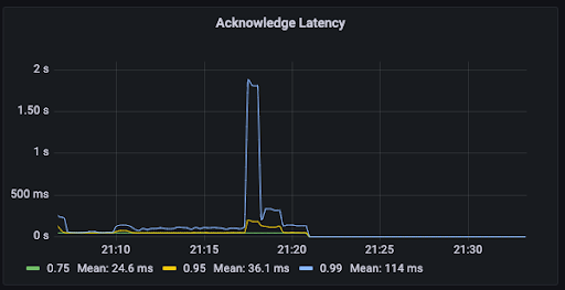 Most of the time latencies are below 100 ms with peaking up in 5 seconds.