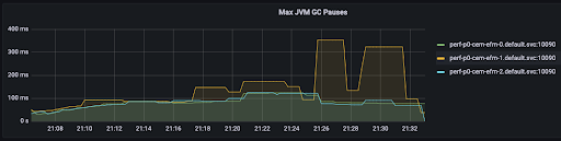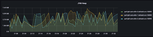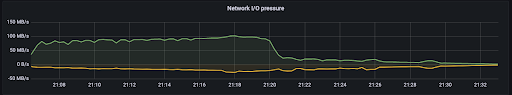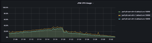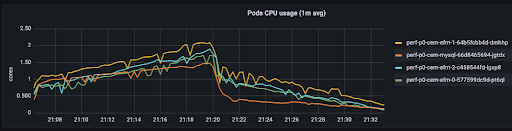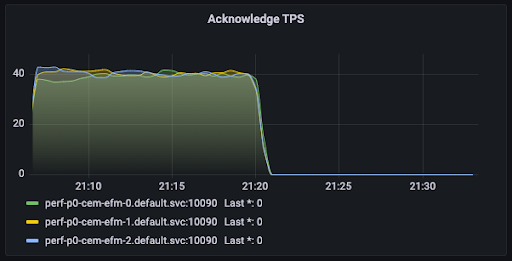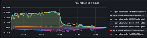 The aggregated network in-bound rate tops out at approximately 100 MB/s, 30 MB/s per Edge Flow Manager node, and 5 MB/s for the database instance. Higher network traffic can be observed in the first half of the test. The reason behind this is when the agents are registering to the Edge Flow Manager with sending a lightweight heartbeat, the Edge Flow Manager requests the agents to send the agent manifest. Agent manifests are an order of magnitude higher in size than lightweight heartbeats.