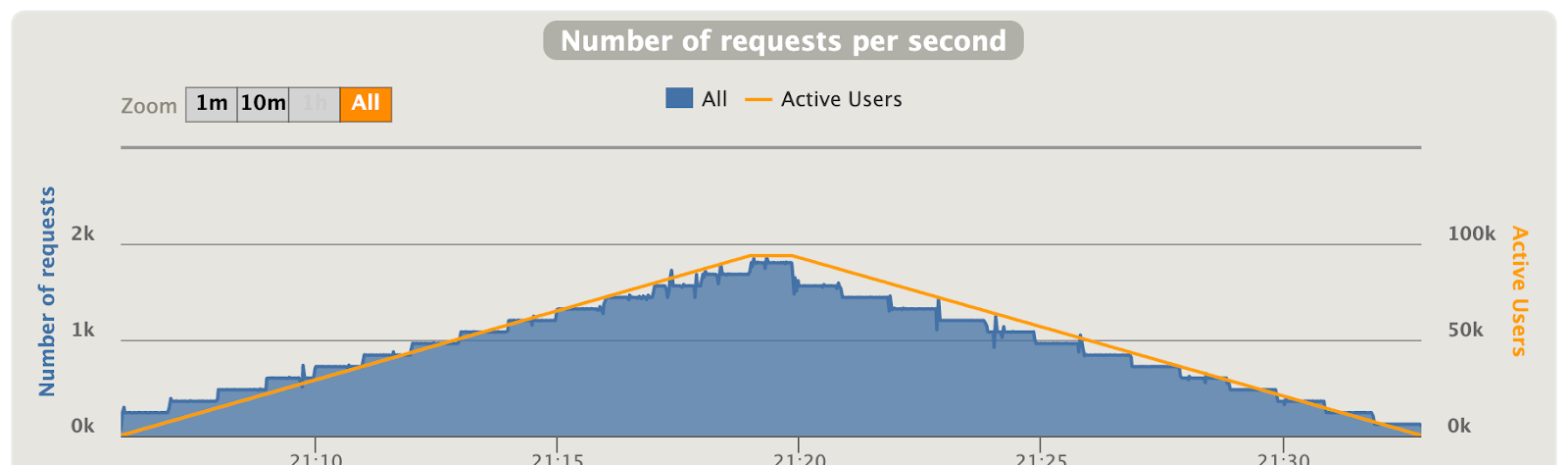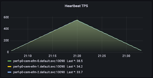In this scenario, 100000 agents are registering into the Edge Flow Manager under the same agent class. 120 new agents are registered every second. Registering the agents takes 833 seconds. Heartbeat interval is 60 seconds. Each agent heartbeats 14 times. This results in nearly 1800 heartbeat TPS maximum. After an agent sends all of the 14 heartbeats, it does not send more so after the heartbeat TPS reaches its maximum. The heartbeat TPS then starts to decrease slowly.