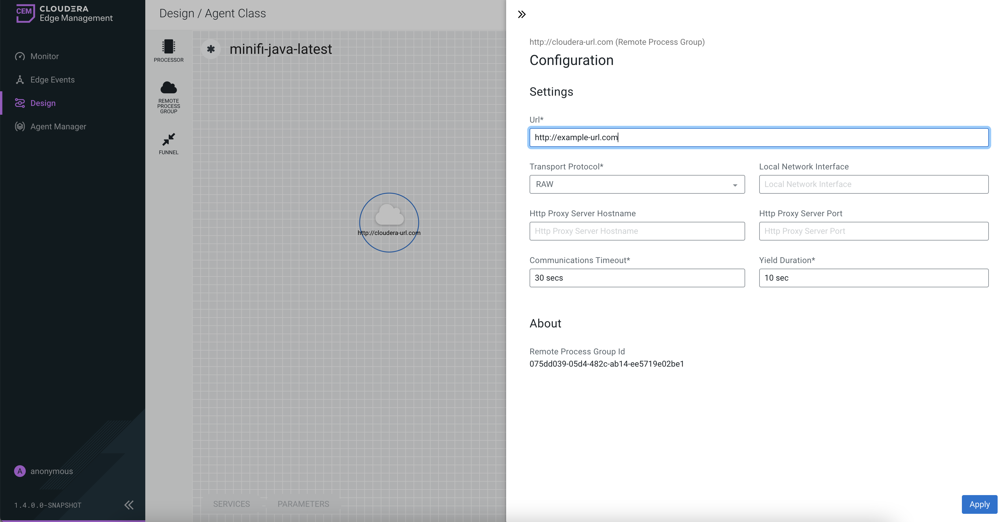 Local Network Interface In some cases, it might be desirable to prefer one network interface over another. For example, if a wired interface and a wireless interface exist, the wired interface might be preferred. This can be configured by specifying the name of the network interface to use in this box. If the value entered is not valid, the Remote Process Group will not be valid and will not communicate with other NiFi instances until this is resolved. HTTP Proxy Server Hostname Specify the host name of the proxy server, if you select HTTP transport protocol. HTTP Proxy Server Port Specify the port number of the proxy server, if you select HTTP transport protocol. Communications Timeout When communication with the RPG takes longer than this amount of time, it will timeout. The default value is 30 seconds. Yield Duration When communication with the RPG fails, it will not be scheduled again until this amount of time elapses. The default value is 10 seconds. - After you configure an RPG, apply the changes by clicking the Apply button.
