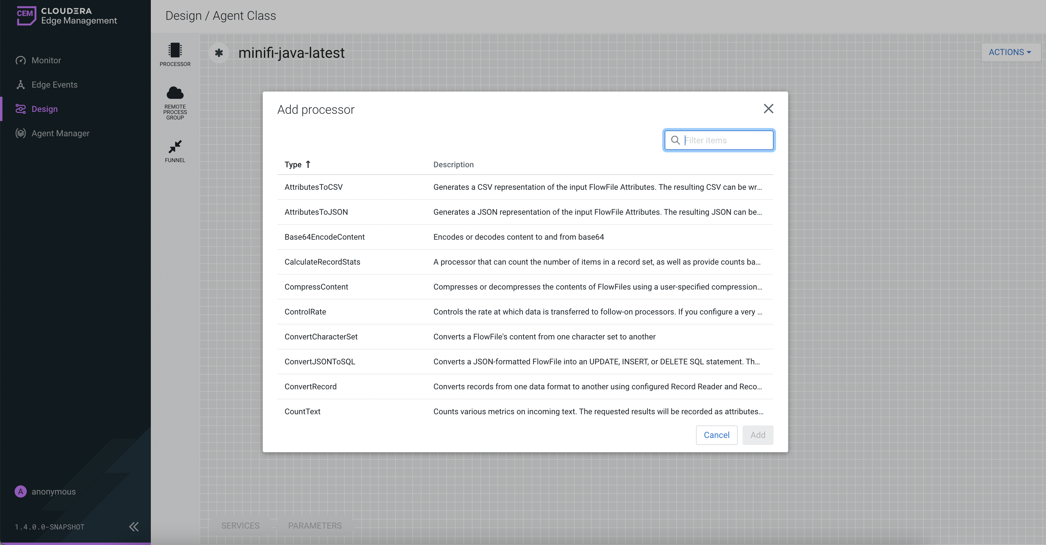 Adding components to the canvas in Cloudera Edge Management