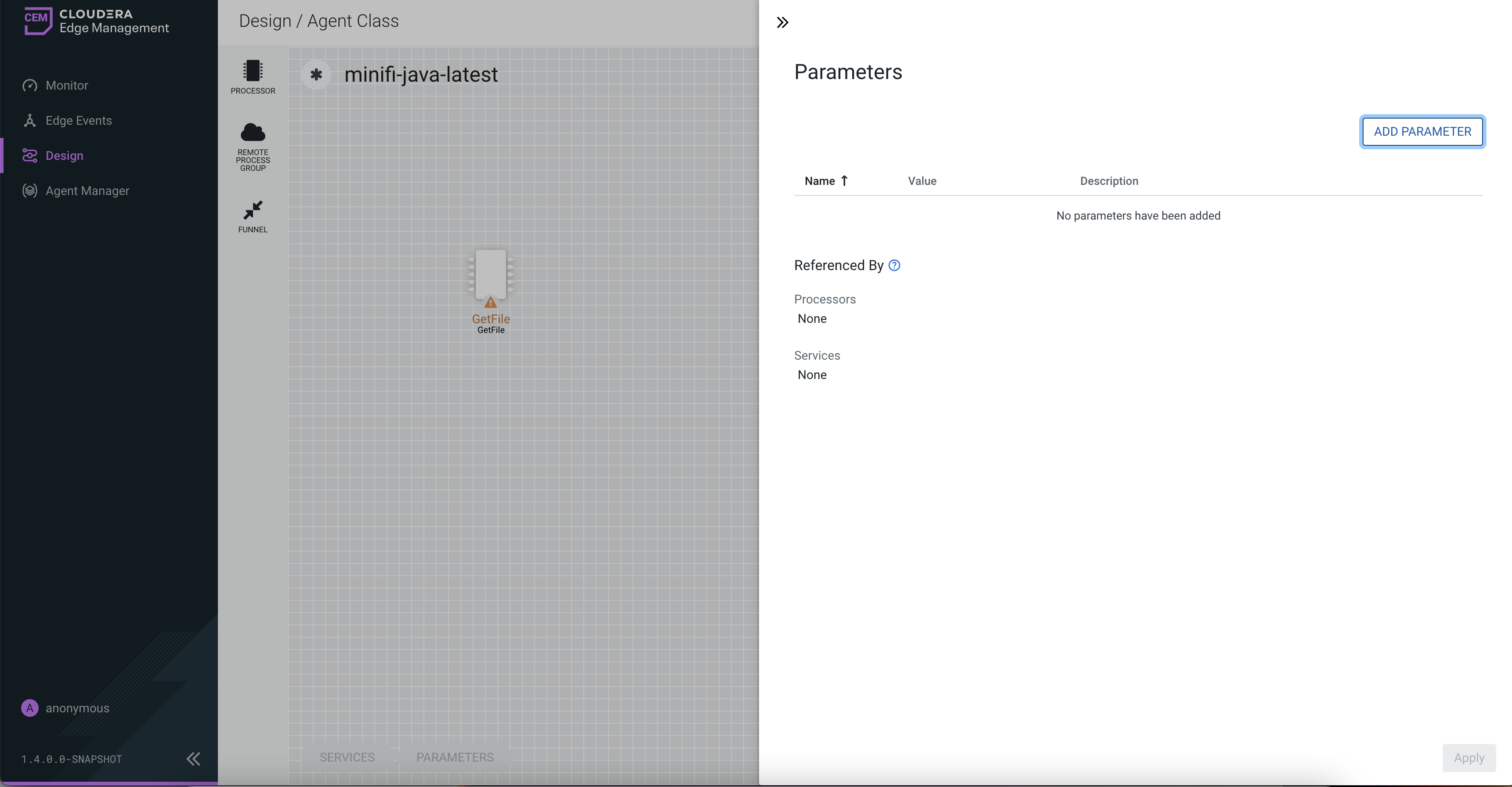 Learn how to add parameters using the Edge Flow Manager UI in Cloudera Edge Management.