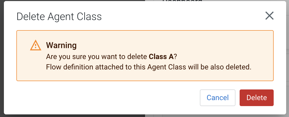 When you delete an agent class, it also removes the flow assigned to that class, but events associated with the deleted class will remain available in the Edge Events view. Edge Flow Manager does not provide any rollback option. You have to export the flow before deleting it, if you want to restore it in the future.