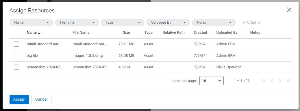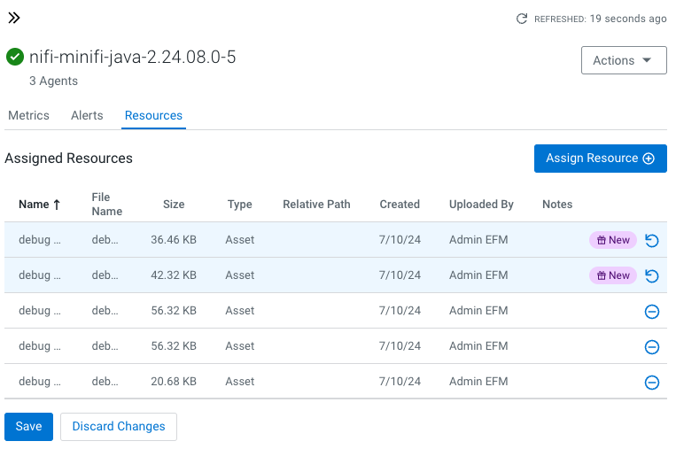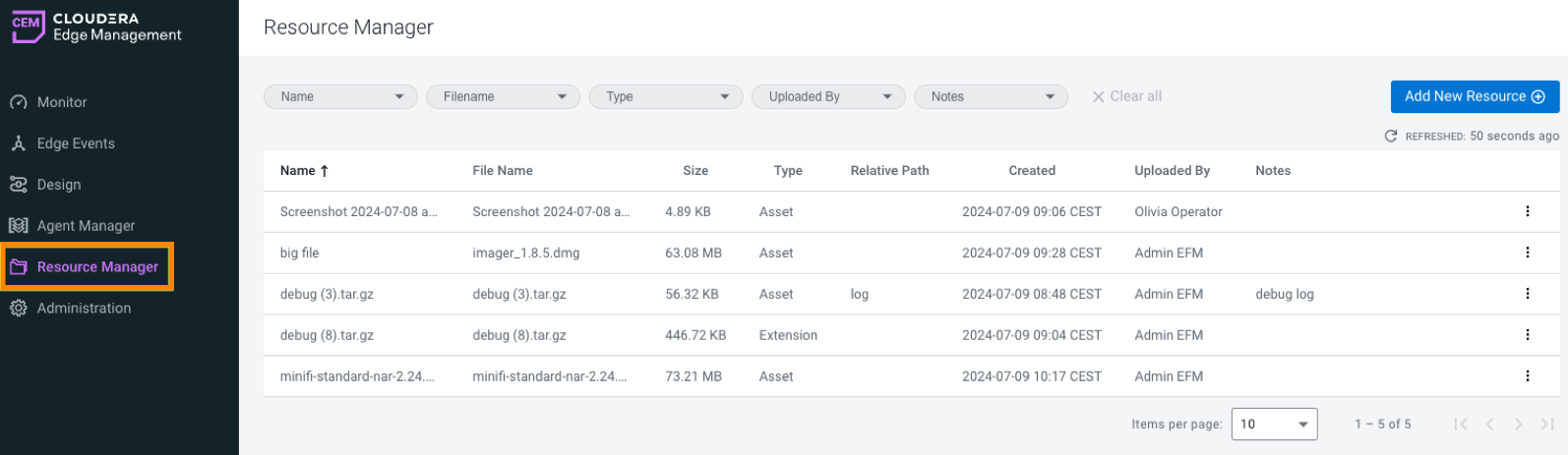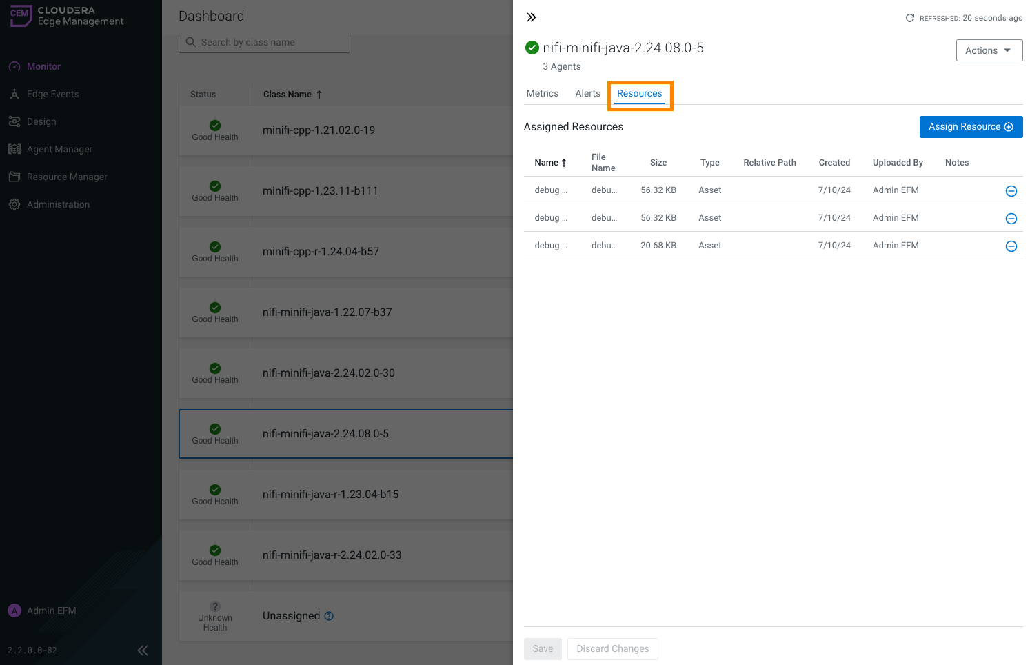 Resource Manager in the Edge Flow Manager UI extends the Asset Push functionality. It allows you to manage existing assets and extensions, upload new assets and extensions, assign them to selected agent classes, and deploy new MiNiFi extensions or ML models at runtime.