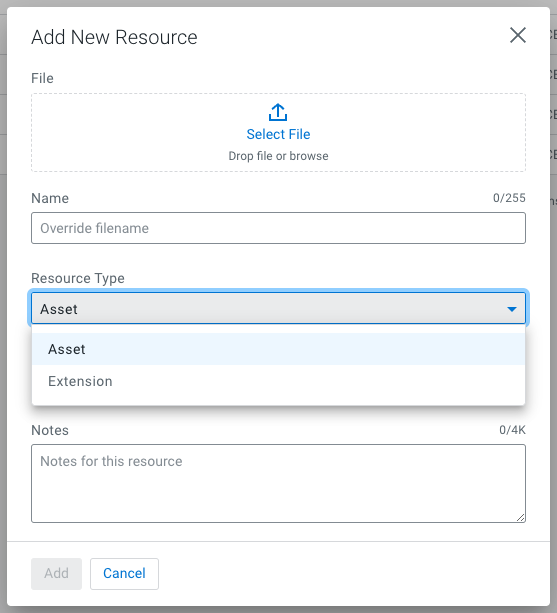 Click Add New Resource to upload new resources. In the Add New Resource pop-up, you can upload a single file or a batch of files at once. If you upload one file at a time, you can change its name. For batch uploads, you can only edit file names one by one from the Resource Manager page.