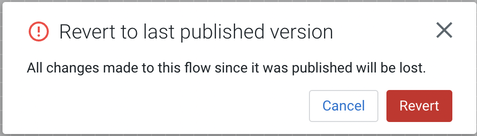 Reverting a dataflow in Cloudera Edge Management Learn how to revert a dataflow using the Edge Flow Manager UI in Cloudera Edge Management. To remove all changes that you made since a flow was published, select Revert to last published from the ACTIONS drop-down menu on the canvas. The Revert to last published version dialog appears as shown in the following image: Select Revert to complete the process. The flow status changes from modified () to current ().