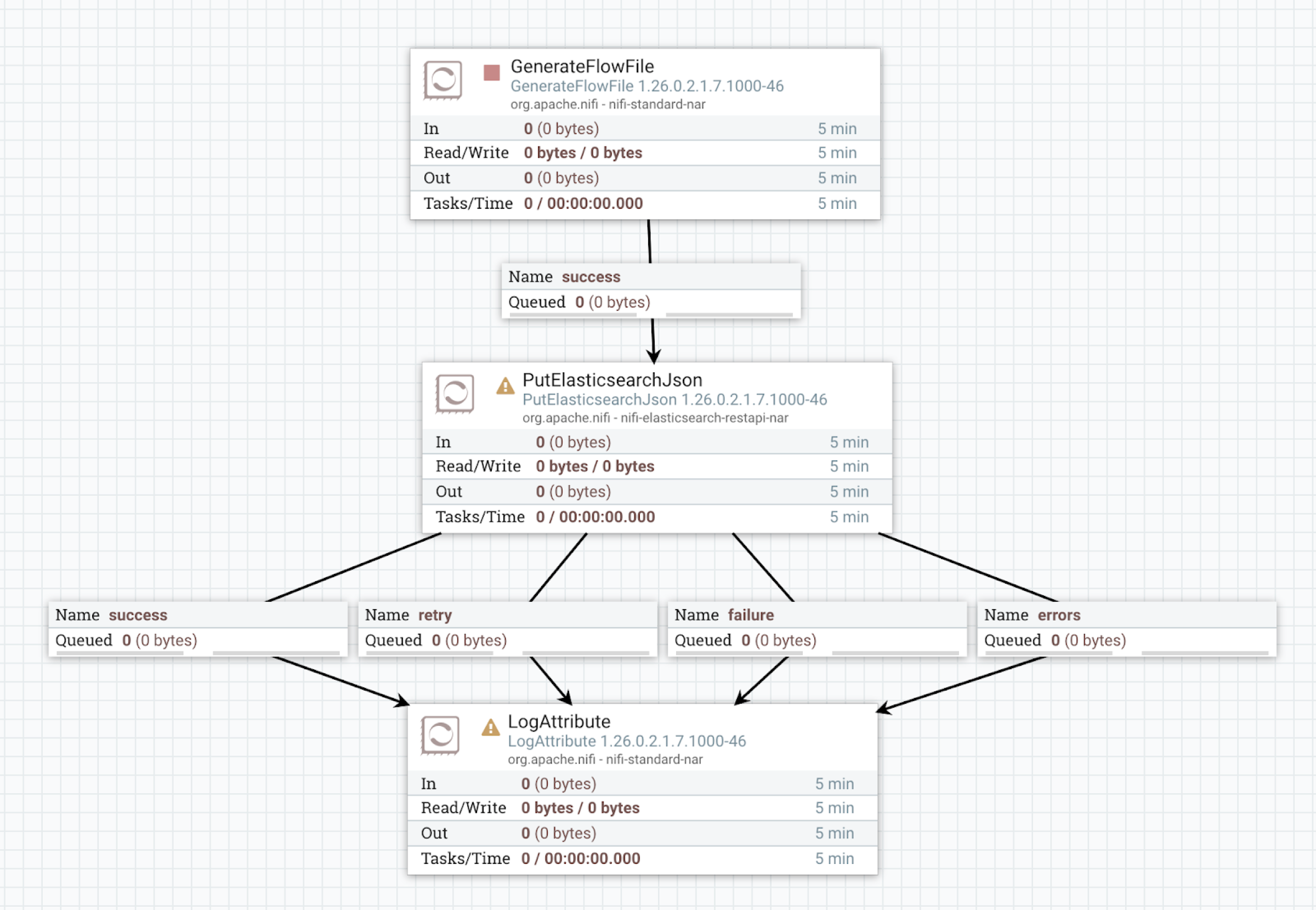 { "sequence" : 3, "type" : "manual-change-request", "subject" : "b428aad6-0194-1000-d73d-9f2332a59f04", "message" : "New relationship [original] has been added, it has to be connected to a downstream processor or terminated.", "context" : { "rule" : "6501a693-b524-4d1a-b11e-69747c2651e8" }To identify the processor affected by these changes, search for the value of the “subject” element in NiFi’s search box. It refers to the PutElasticsearchJson processor. You will find an unbound "original" relationship that needs to be connected to a downstream processor or terminated. Make the necessary modifications manually. Once completed, this change request is resolved.