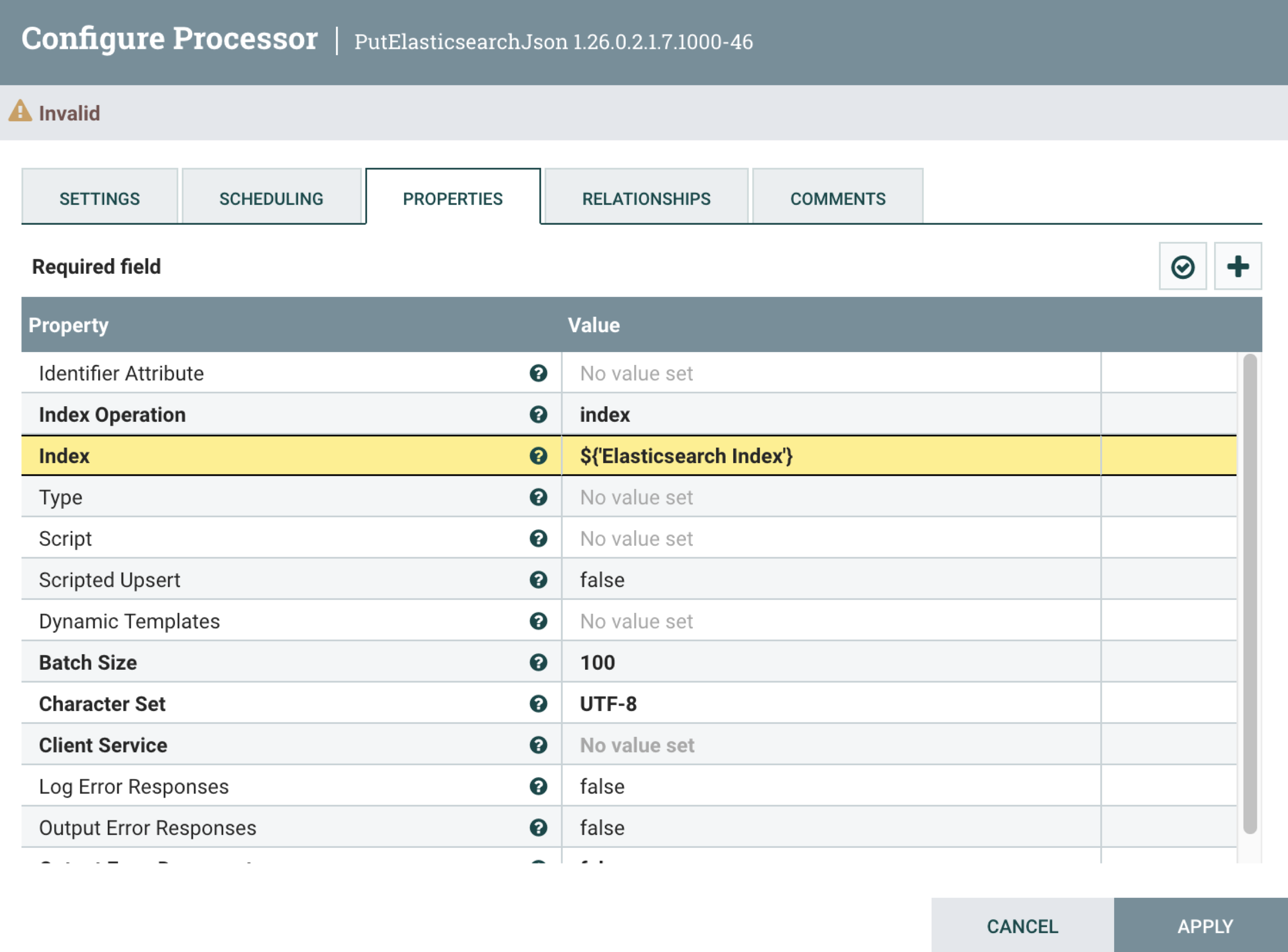 The process group defines a variable called Elasticsearch Index. This variable is referenced in the PutElasticsearchJson processor’s Index property.