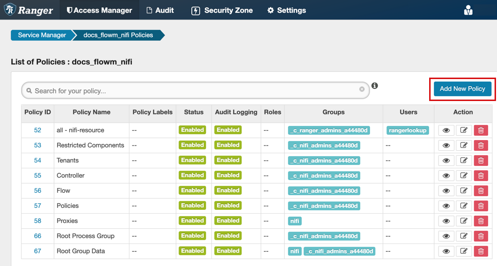 A user might need access to specific NiFi or NiFi Registry resources such as a process group or bucket. If the user cannot access the component through an inherited Ranger access policy, then you must create a custom Ranger access policy for the specific component and add the user to this policy. If all the users in a group require the same access, you can add the user group to the Ranger access policy.
