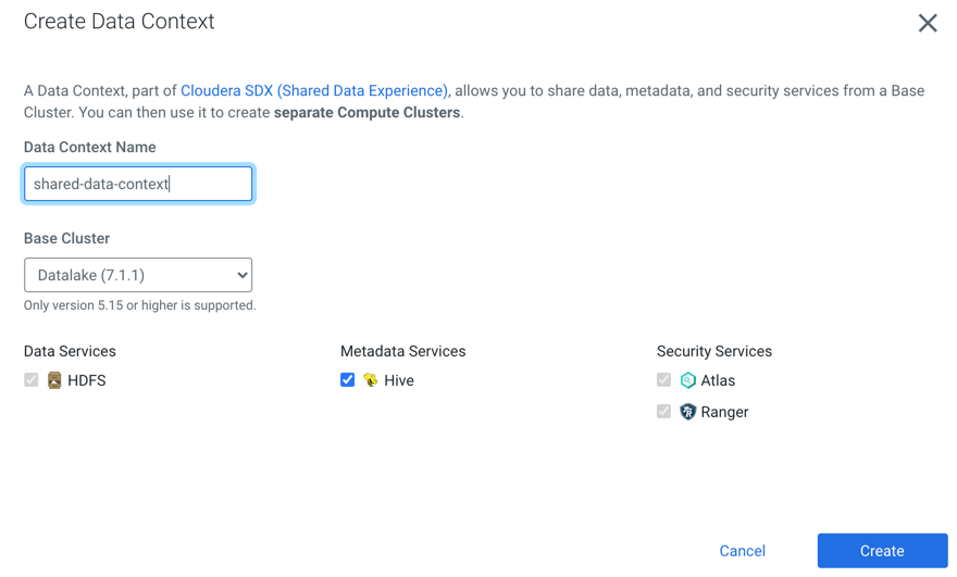 Create a Shared Data Context to all the Compute cluster to access data, metadata, and security services from the Base cluster. This shared context required before creating Compute clusters.