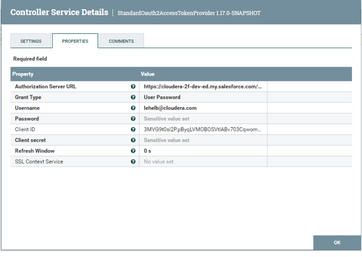 You require the following controller services for this example of a NiFi dataflow moving data out of Salesforce.