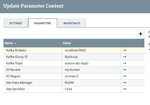 5. Finally, repeat steps 1-3 to create ABC Kafka to S3 Parameter Context inheriting all parameters from the ABC Kafka and Site and the S3 Parameter Contexts.