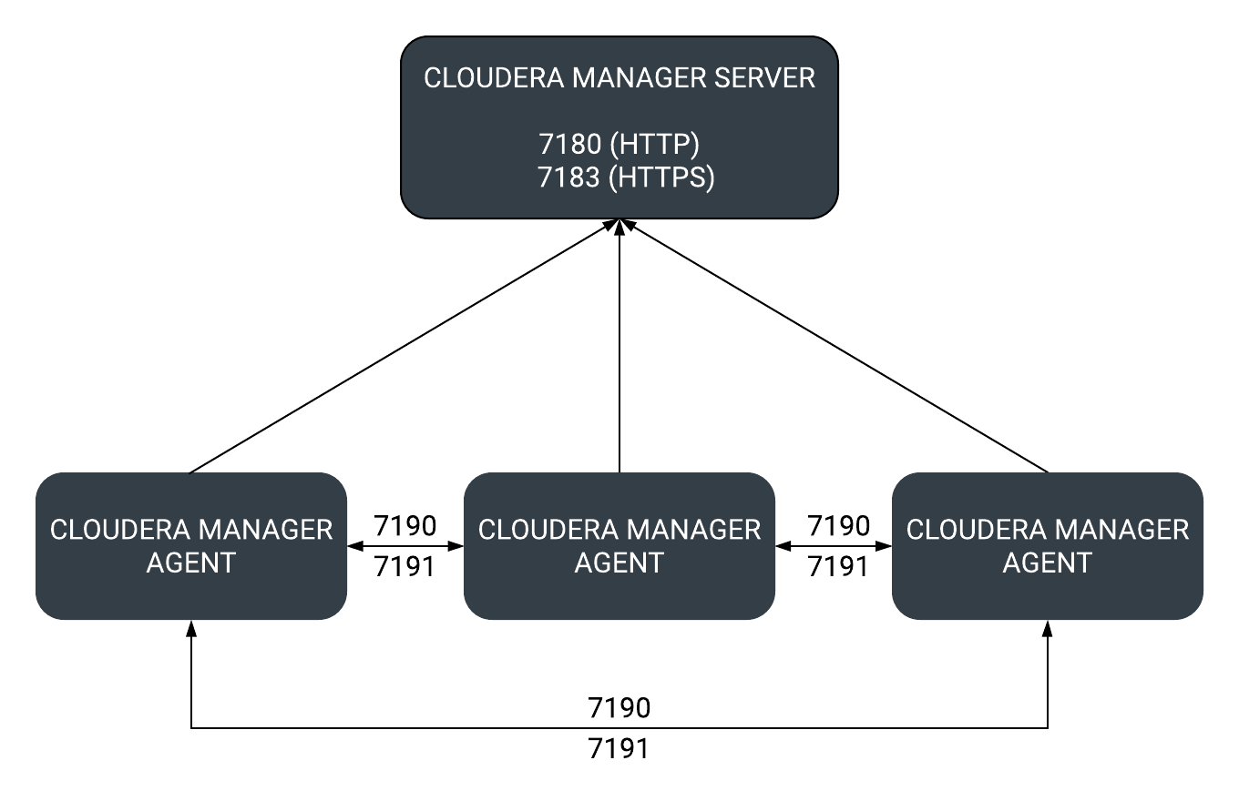 The diagrams and tables below provide an overview of some of the ports used by Cloudera Manager and Cloudera Management Service roles.