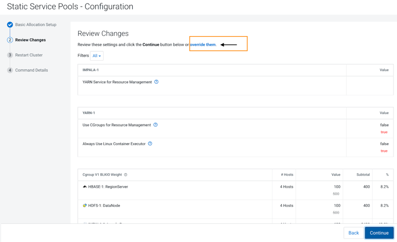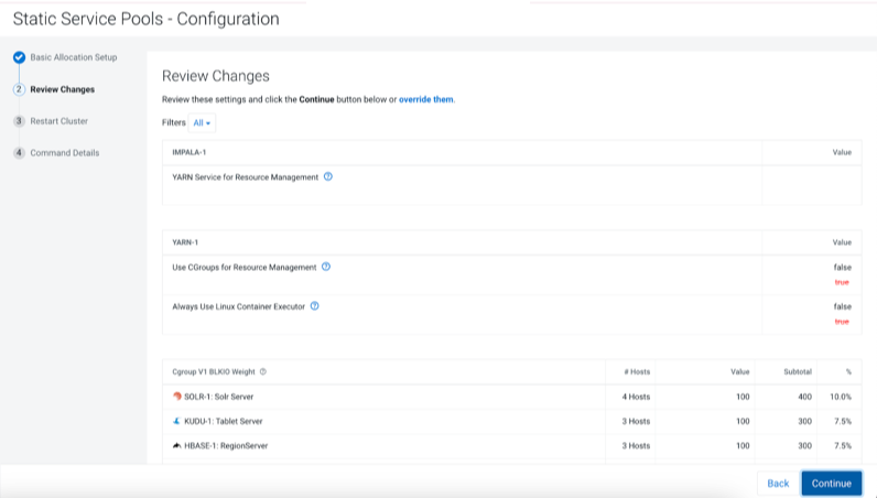 proceed.Step 2 of 4: Review Changes - The allocation of resources for each resource type and role displays with the new values as well as the values previously in effect. The values for each role are set by role group; if there is more than one role group for a given role type (for example, for RegionServers or DataNodes) then resources will be allocated separately for the hosts in each role group.