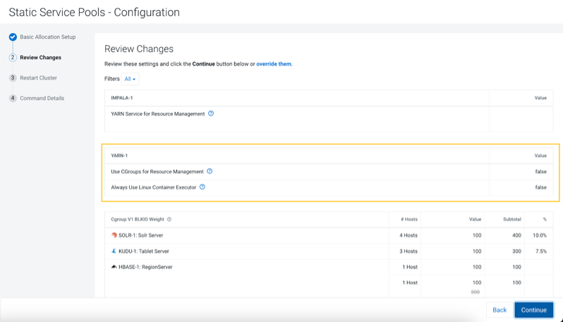 - Take note of changed settings. If you have previously customized these settings, then check the resource allocations for each service based on your cgroup version carefully. You can change your resource allocations by clicking the Back button to go to the previous page and change your allocations.