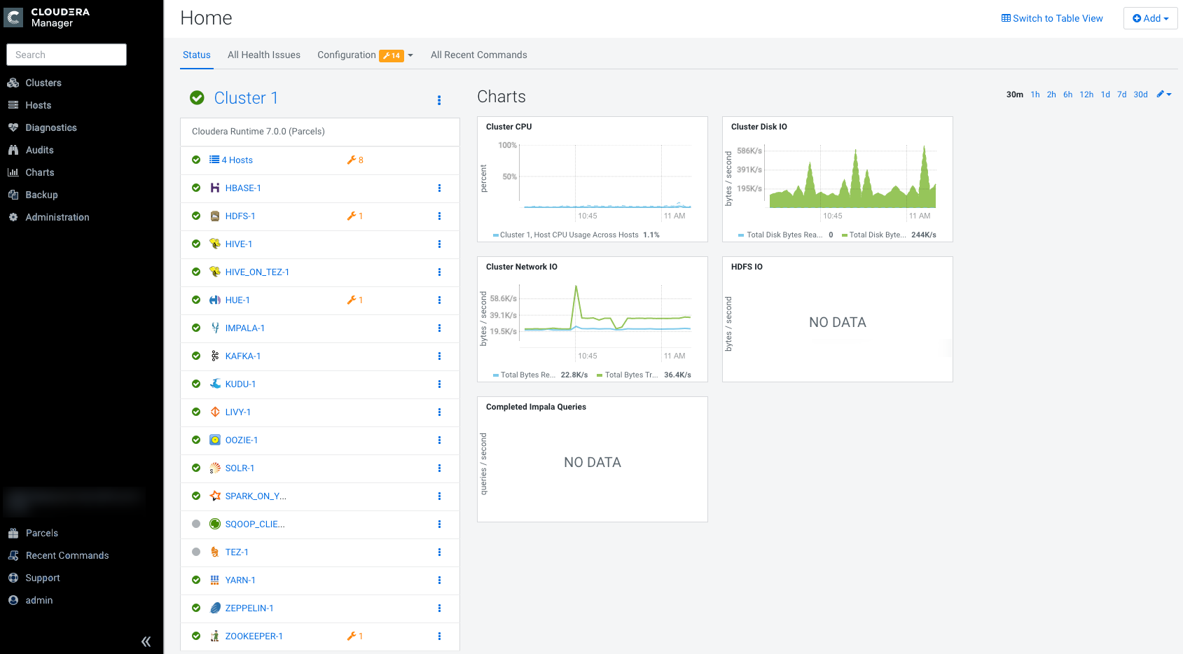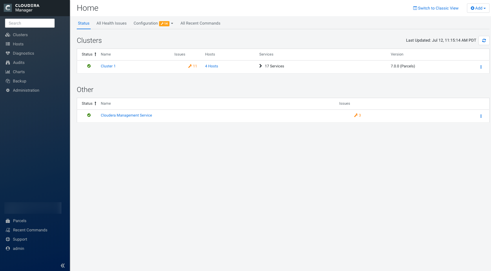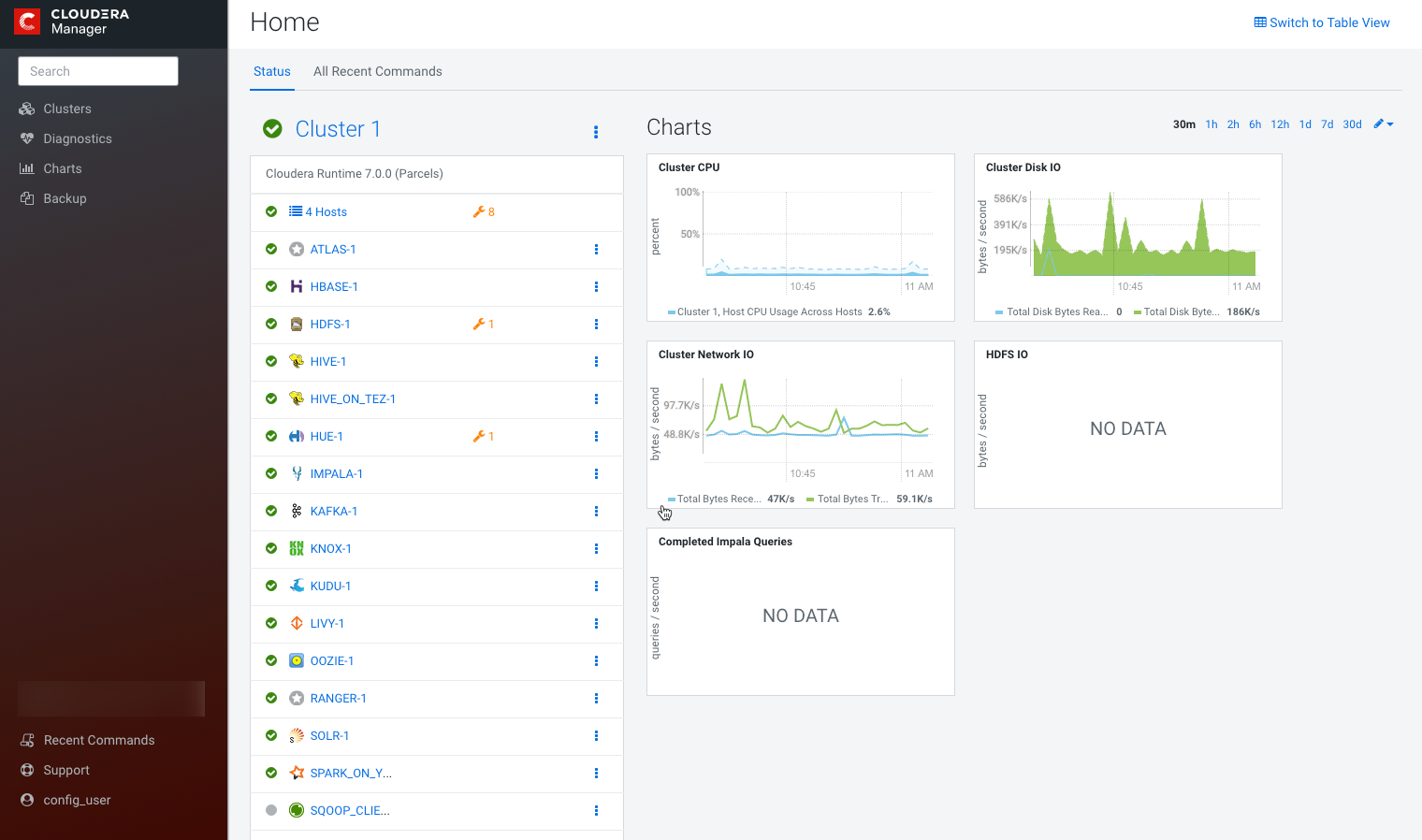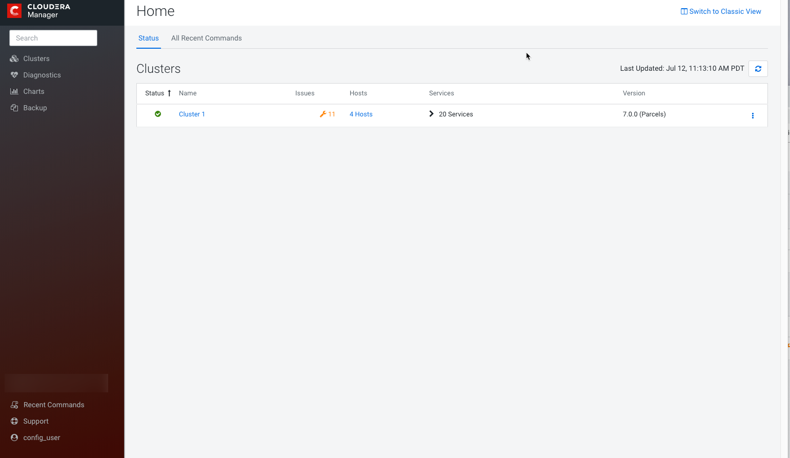 The Status tab has two potential views: Table View and Classic View. The Classic View contains a set of charts for the selected cluster, while the Table View separates regular clusters, compute clusters, and other services into summary tables. You can use the Switch to Table View and Switch to Classic View links on each view to switch between the two views. Cloudera Manager remembers which view you select and remains in that view.