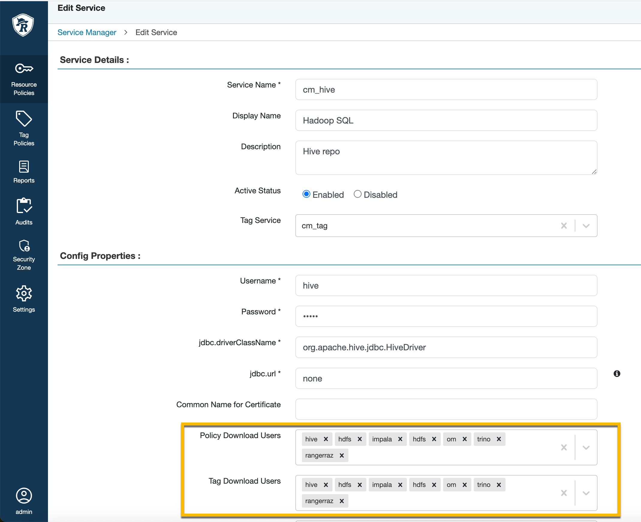10. Log in to the Ranger Admin web UI. On the Service Manager page, click Edit for the Hadoop SQL service, then verify that hdfs has been added to the Policy Download Users and Tag Download Users configurations.