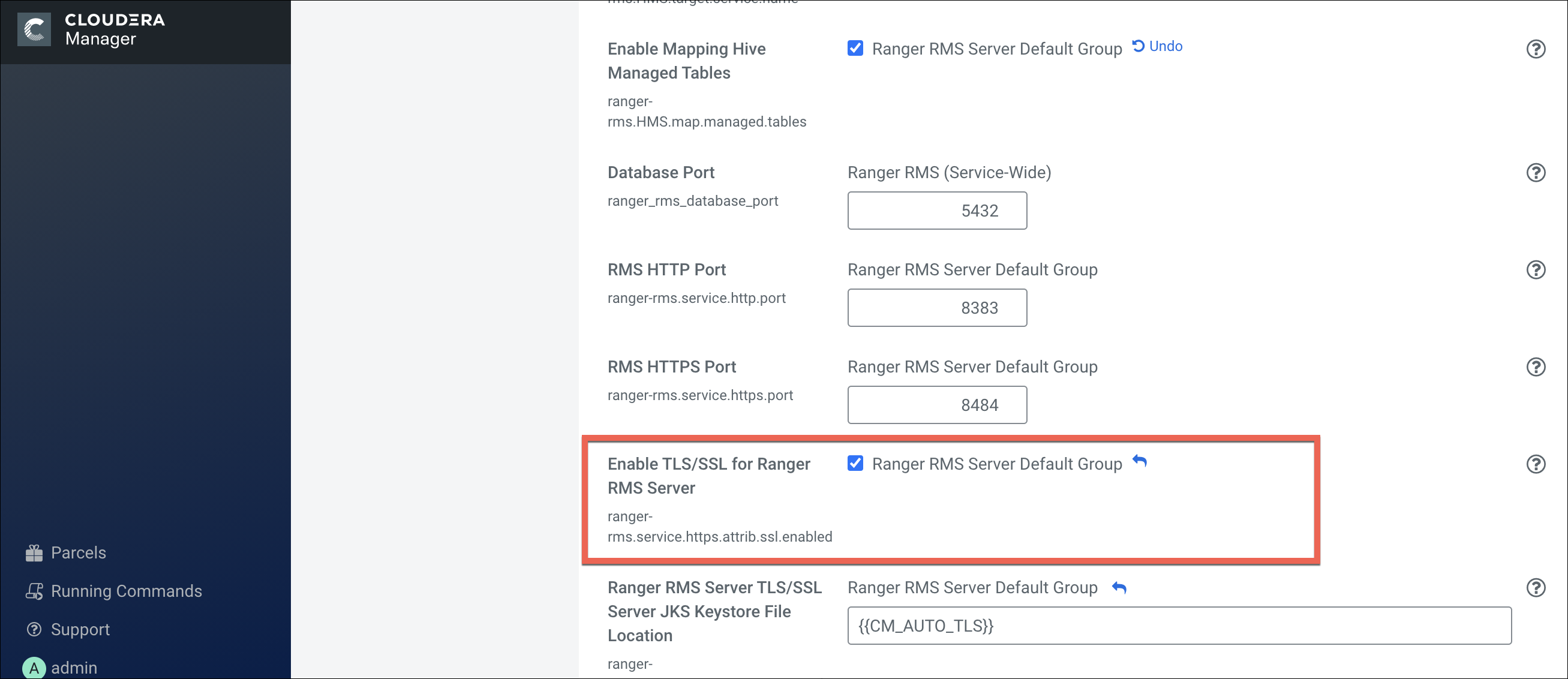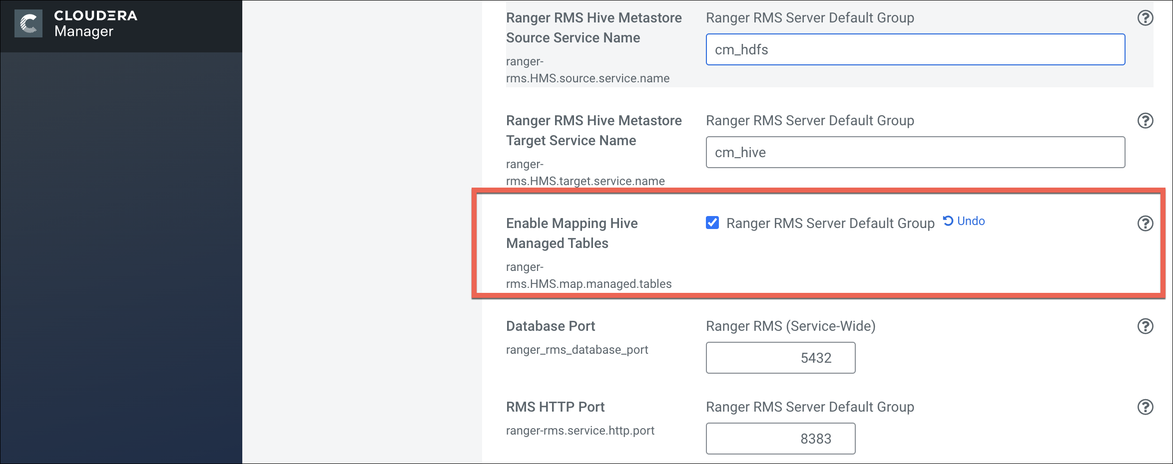 9. In Cloudera Manager > Hive Service > Configuration verify that the Hive Metastore Access Control and Ranger RMS Proxy User Hosts property, hadoop.proxyuser.rangerrms.hosts is set to *.