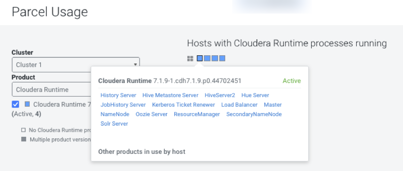 The host map at the right shows each host in the cluster, with the status of the parcels on that host. If the host is running the processes from the currently activated parcels, the host is indicated in blue. A black square indicates that a parcel has been activated, but that all the running processes are from an earlier version of the software. This occurs, for example, if you have not restarted a service or role after activating a new parcel. If you have individual hosts running components installed as packages, the square is empty.