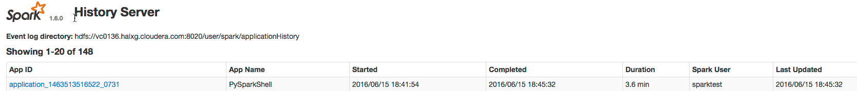 Consider a job consisting of a set of transformation to join data from an accounts dataset with a weblogs dataset in order to determine the total number of web results for every account and then an action write the result to HDFS. In this example, the write is performed twice, resulting in two jobs. To view the application UI, in the History Server click the link in the App ID column: