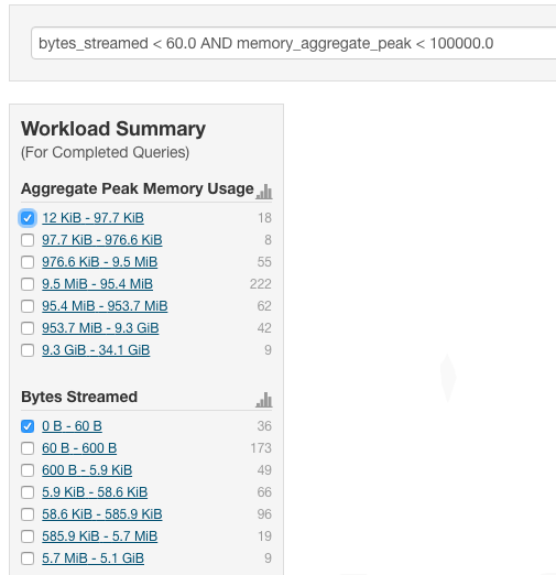 one or more attributes, and click Close.The attributes display in the Workload Summary section along with values or ranges of values that you can filter on. The values and ranges display as links with checkboxes. Select one or more checkboxes to add the range or value to the query. Click a link to run a query on that value or range. For example: