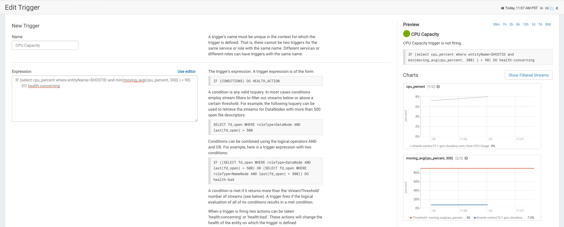 This trigger fires whenever the CPU percentage exceeds 90%. However, just exceeding 90% of available CPU resources is not necessarily a bad thing. What would be of more concern is if CPU resources were to consistently exceed 90% over an extended period. You can modify the trigger to evaluate the average CPU usage over time.