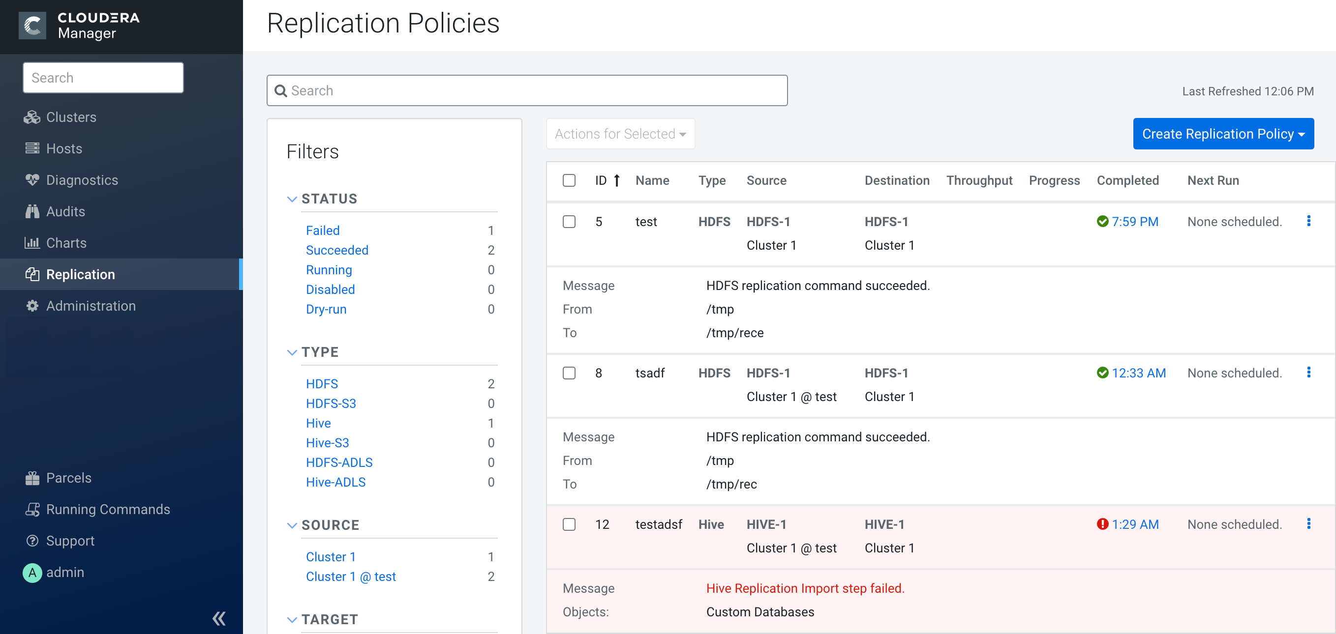 The following sample image shows the Replication Policies page in Cloudera Manager: