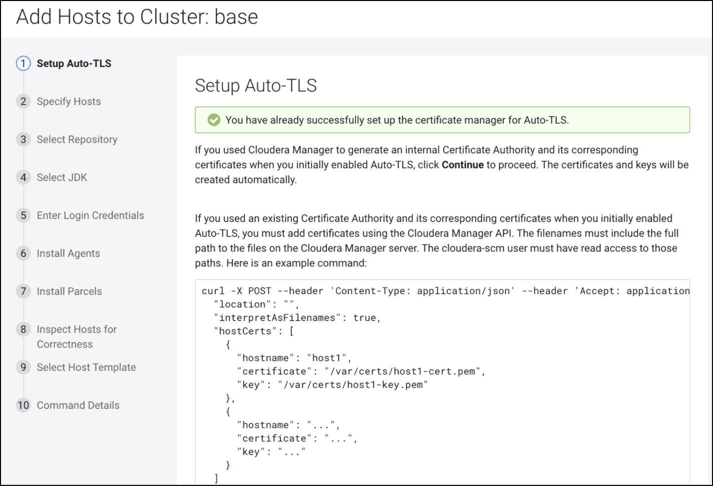 curl -u admin:admin -X POST --header 'Content-Type: application/json' --header 'Accept: application/json' -d '{ "location": "/opt/cloudera/AutoTLS", "interpretAsFilenames": true, "hostCerts": [ { "hostname": "ccycloud-10.vcdp71.root.hwx.site", "certificate": "/tmp/auto-tls/certs/ccycloud-10.vcdp71.root.hwx.site.pem", "key": "/tmp/auto-tls/certs/ccycloud-10.vcdp71.root.hwx.site.pem" } ] }' 'https://ccycloud-7.vcdp71.root.hwx.site:7183/api/v41/cm/commands/addCustomCerts' - Continue to add hosts.