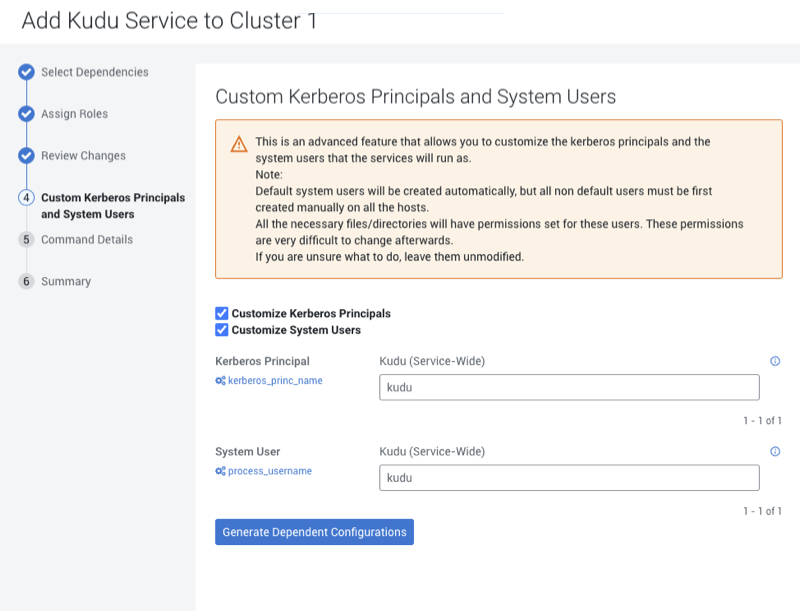 The Custom Kerberos Principals and System Users is an advanced feature that allows you to customize the Kerberos Principals and System Users for the Cloudera Runtime services. The following steps explain how to customize the Kerberos Principals and System Users in the Cloudera Manager.